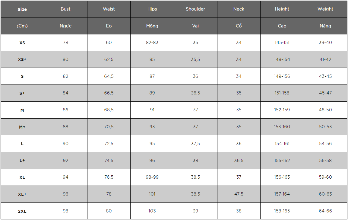 Thông số sản phẩm size M (mỗi size +/- 2cm)