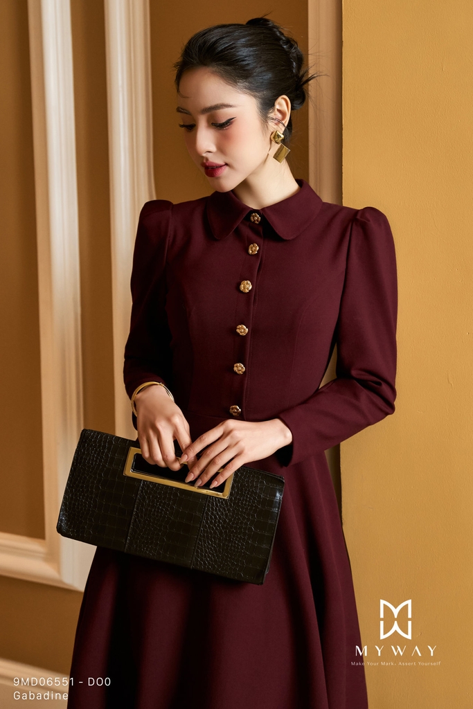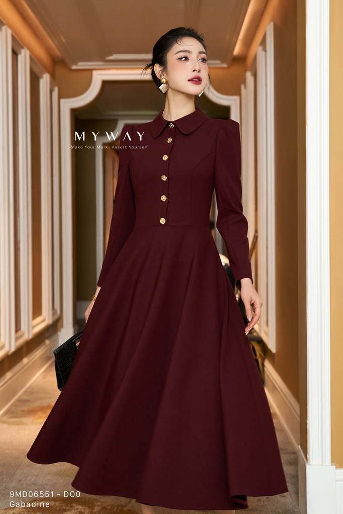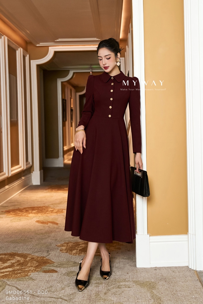 Đầm xòe được thiết kế với phom trên ôm gọn gàng tôn dáng, chân váy xòe nhẹ nhàng giúp che khuyết điểm cơ thể, cổ biến kiểu tinh tế, tay dài và chiều dài qua bắp mang lại vẻ ngoài thanh lịch, hiện đại. Sản phẩm có túi tiện dụng và lớp lót bên trong tạo cảm giác thoải mái khi mặc. Đầm được may từ chất liệu gabadine nhập khẩu cao cấp đã qua xử lý, bề mặt vải mịn, đứng phom và giữ dáng chuẩn chỉnh. Điểm nhấn nổi bật nằm ở chi tiết khuy trang trí hài hòa với chất liệu vải và phom dáng dễ mặc, giúp tổng thể thêm tinh tế và sang trọng. Gam màu đỏ nâu trầm ấm, thanh lịch, tôn da và dễ phối cùng phụ kiện tông trung tính hoặc ánh kim, phù hợp cho môi trường công sở, sự kiện hoặc những dịp cần phong cách hiện đại với khả năng ứng dụng cao.