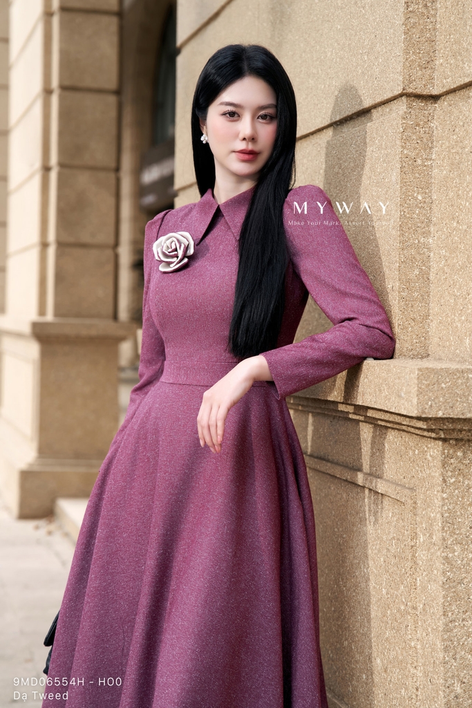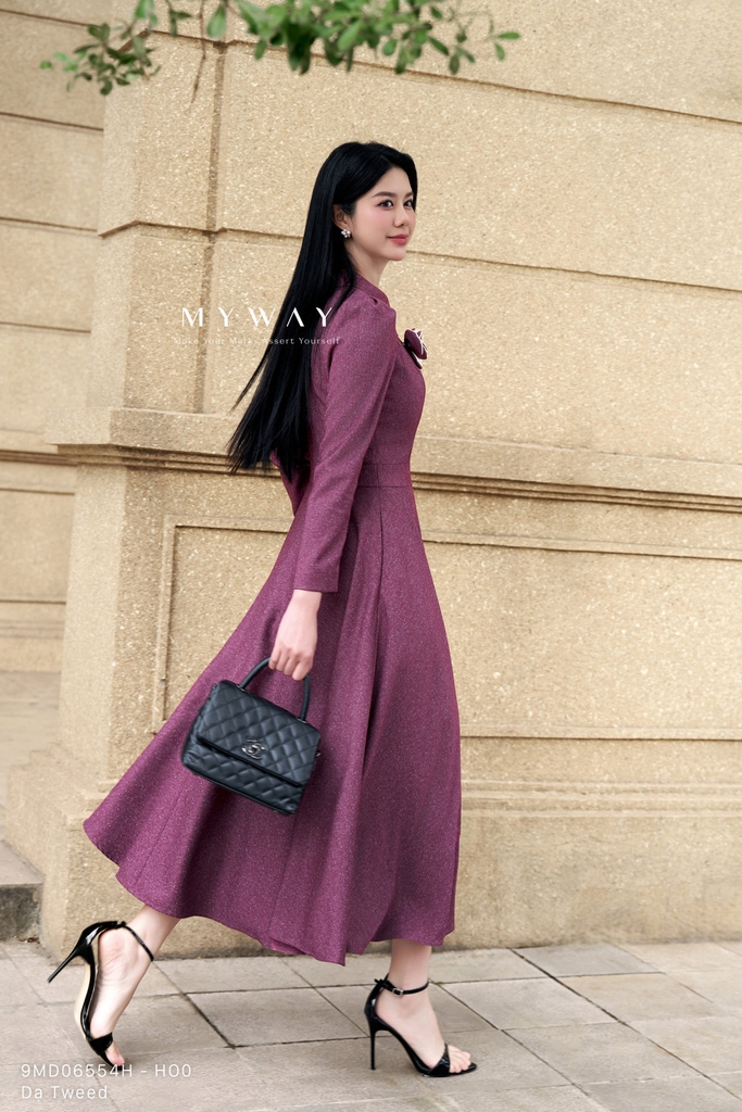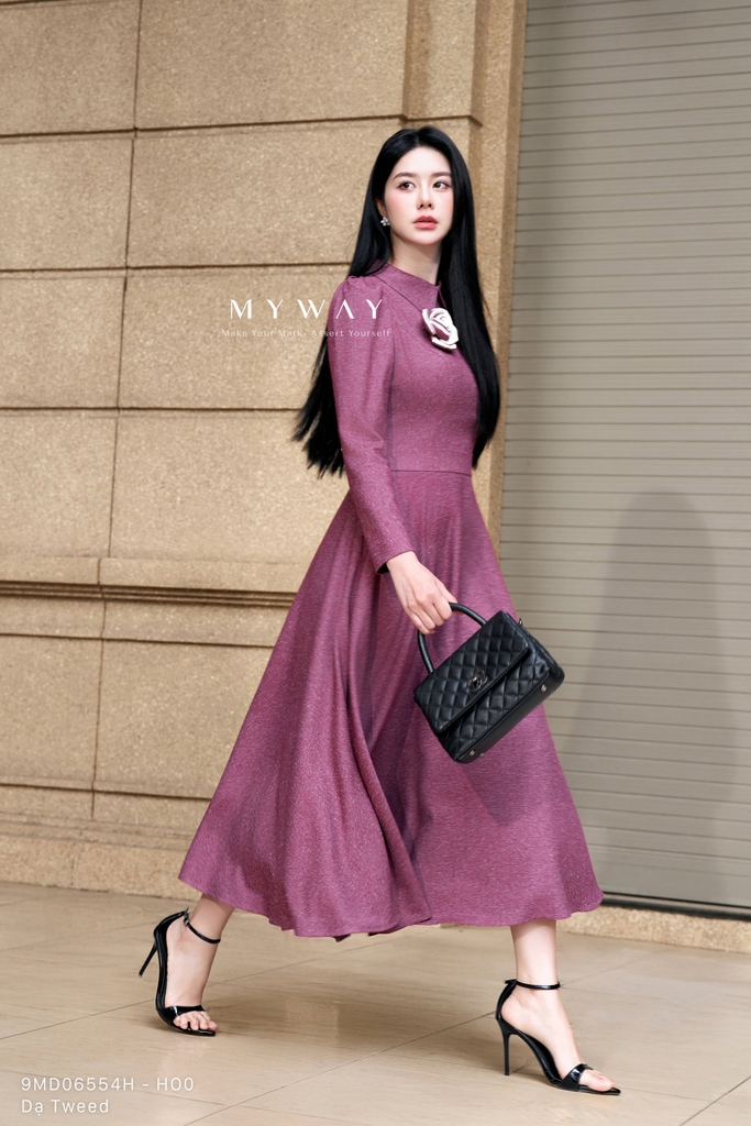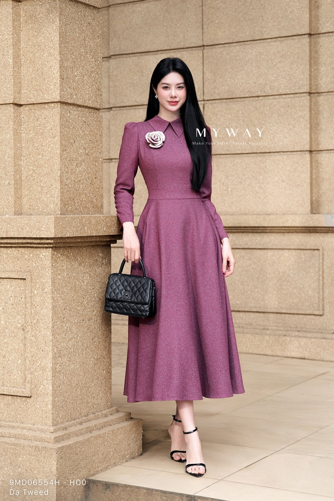 Đầm xòe thiết kế trên ôm dưới xòe tôn dáng, cổ biến kiểu tinh tế, dài qua bắp, tay dài, được hoàn thiện với túi tiện lợi và lớp lót mang lại cảm giác thoải mái khi mặc, đồng thời tạo điểm nhấn bằng hoa cài nổi bật kết hợp cùng chất liệu vải sang trọng. Sản phẩm được may từ chất liệu dạ tweed mỏng nhập khẩu cao cấp đã qua xử lý, giúp giữ phom dáng chuẩn chỉnh, mang đến vẻ quyến rũ và hiện đại. Điểm nhấn của đầm nằm ở phom dáng xòe thanh lịch kết hợp cùng chất liệu vải muối tiêu độc đáo và hoa cài tinh xảo, tạo nên tổng thể hài hòa, dễ ứng dụng. Gam màu muối tiêu phối hồng và xanh tím than đậm mang sắc thái trang nhã nhưng vẫn nổi bật, phù hợp trong nhiều hoàn cảnh khác nhau.