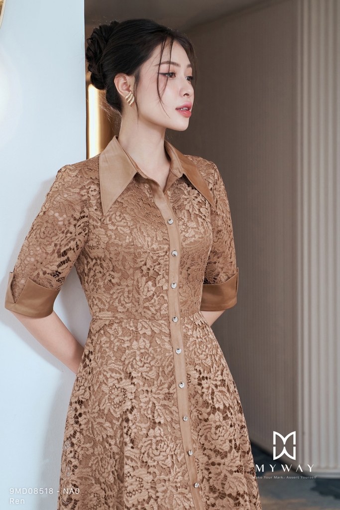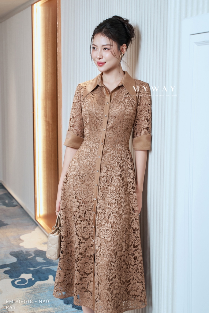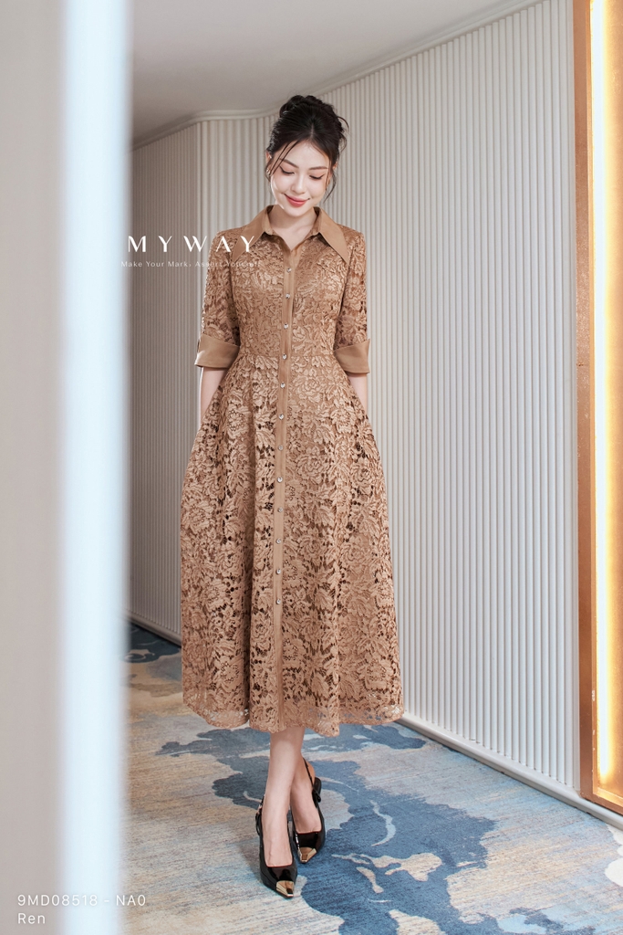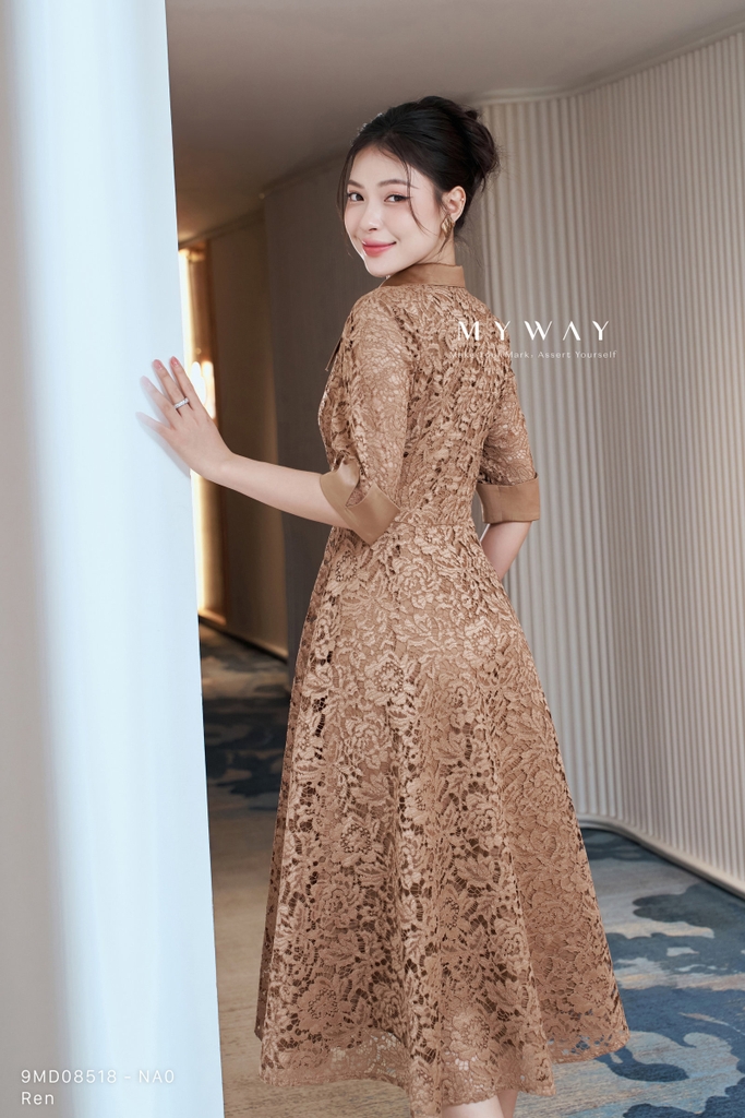 Đầm xòe thiết kế dáng trên ôm dưới xòe, cổ biến kiểu nhẹ nhàng, tay ngắn và độ dài qua bắp chân tạo nên vẻ nữ tính và thanh thoát cho người mặc. Sản phẩm được chế tác từ chất liệu ren nhập khẩu cao cấp đã qua xử lý kỹ lưỡng, mang đến phom dáng chuẩn chỉnh và cảm giác sang trọng. Họa tiết hoa tinh tế trên nền màu nâu và trắng giúp tổng thể thêm phần mềm mại, thanh lịch mà vẫn giữ được nét hiện đại. Điểm nhấn của thiết kế nằm ở phần kết cấu váy cùng hàng khuy trang trí khéo léo, tôn lên sự duyên dáng và giúp che khuyết điểm cơ thể hiệu quả. Đầm có lót bên trong, mang lại sự thoải mái cho người mặc, dễ dàng ứng dụng trong nhiều hoàn cảnh từ công sở, dạo phố đến các buổi tiệc nhẹ. Tổng thể toát lên phong thái thanh lịch, thời thượng và khả năng phối đồ cao, phù hợp với quý cô yêu nét đẹp tinh tế và hiện đại.