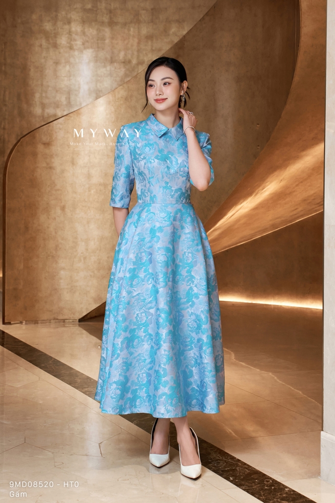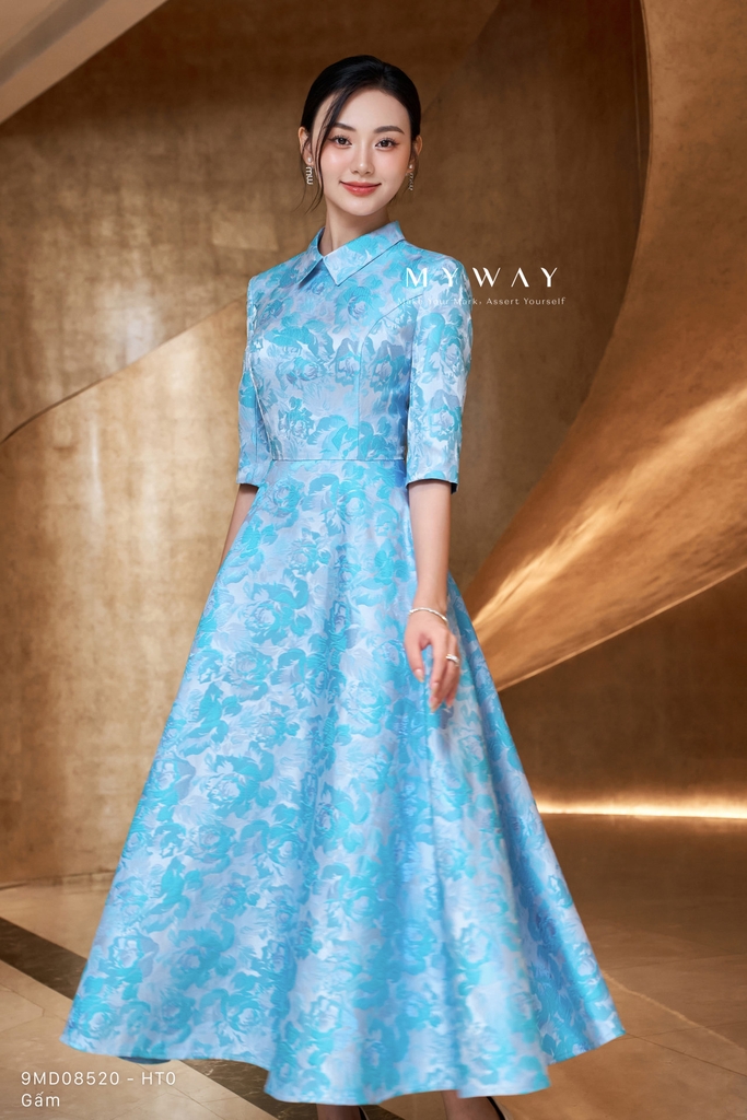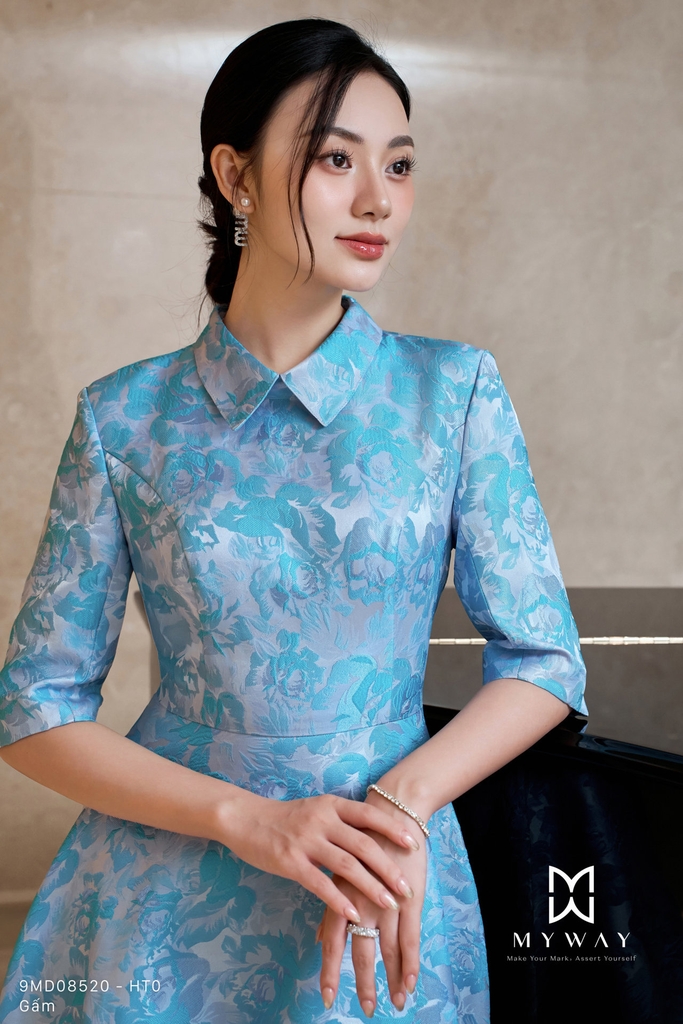 Đầm xòe dáng trên ôm dưới xòe, cổ cách điệu, tay ngắn và dài qua bắp mang vẻ đẹp nữ tính, thanh lịch và đầy cuốn hút. Sản phẩm được thiết kế từ chất liệu gấm nhập khẩu cao cấp đã qua xử lý, giúp giữ phom chuẩn chỉnh, tạo nên vẻ sang trọng và hiện đại cho người mặc. Điểm nhấn nổi bật nằm ở họa tiết vải độc đáo với sự hòa quyện tinh tế giữa các gam màu xanh, be và tím, mang lại chiều sâu thị giác và cảm giác tươi mới. Thiết kế phần thân trên ôm nhẹ tôn dáng, kết hợp chân váy xòe mềm mại giúp khéo léo che khuyết điểm cơ thể, đồng thời tôn lên nét duyên dáng của quý cô. Đầm có túi và lót tiện dụng, đảm bảo sự thoải mái tối đa khi di chuyển. Đây là lựa chọn hoàn hảo cho những quý cô yêu phong cách hiện đại, thanh lịch nhưng vẫn muốn giữ nét dịu dàng, nữ tính trong mọi khoảnh khắc.