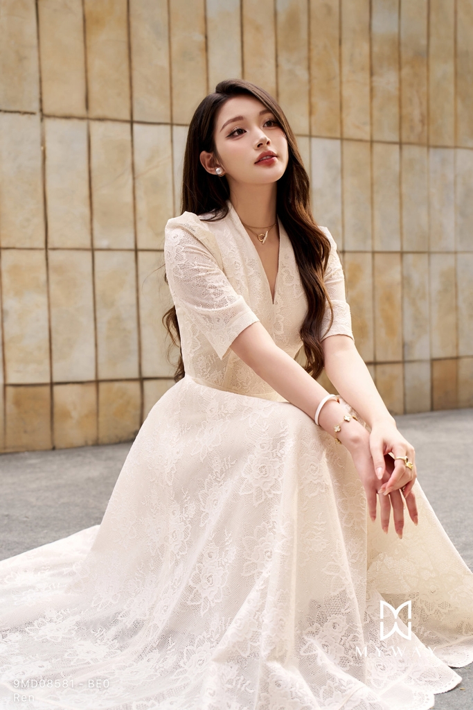 Đầm xòe thiết kế trên ôm dưới xòe với cổ biến kiểu thanh lịch, chiều dài qua bắp, tay ngắn, khóa sau kín đáo, không túi và có lót giúp tăng độ thoải mái khi mặc; sản phẩm nổi bật với sự kết hợp màu sắc be và đỏ hài hòa, trong đó nền be trang nhã làm nổi bật các họa tiết hoa đỏ rực rỡ, tạo hiệu ứng thị giác cuốn hút nhưng vẫn giữ được nét tinh tế và sang trọng; đầm được thiết kế từ chất liệu ren nhập khẩu cao cấp đã qua xử lý, bề mặt vải mềm mại, họa tiết sắc nét và lên phom chuẩn chỉnh, tôn đường cong cơ thể; điểm nhấn nằm ở họa tiết hoa cùng chất liệu ren cao cấp, phom váy dễ mặc và khéo léo che khuyết điểm, mang lại sự tự tin cho người mặc; thiết kế giúp toát lên vẻ nữ tính, phong cách hiện đại và khả năng ứng dụng cao trong nhiều dịp khác nhau.