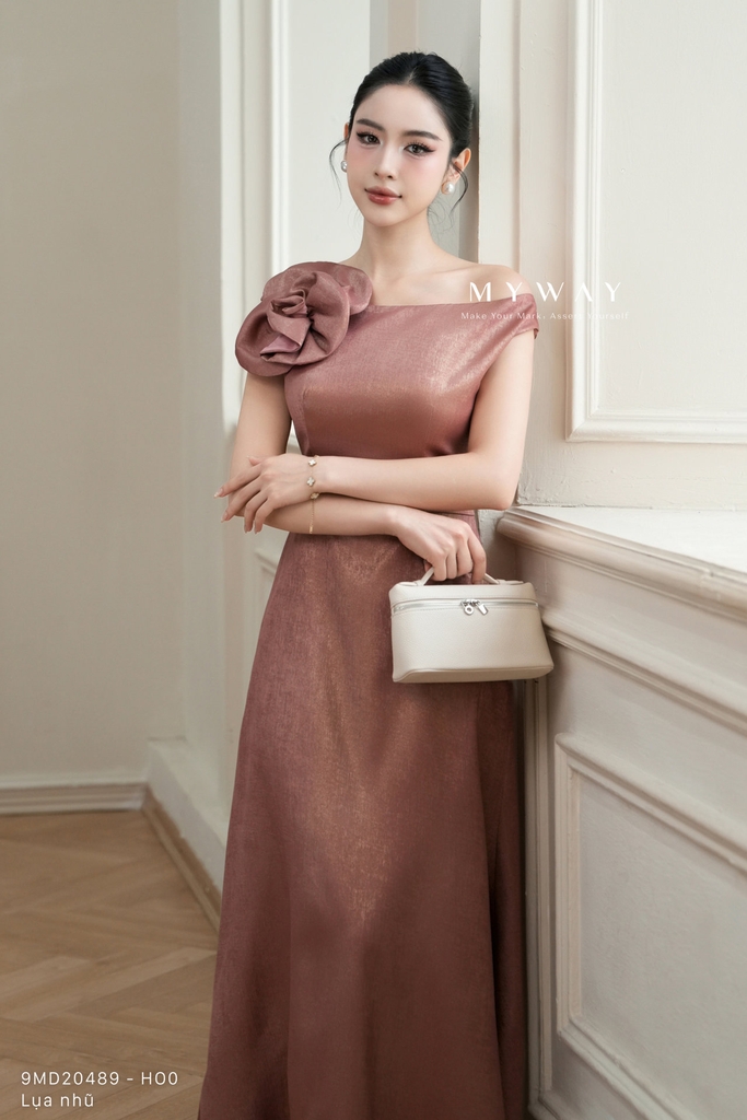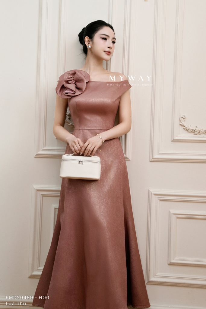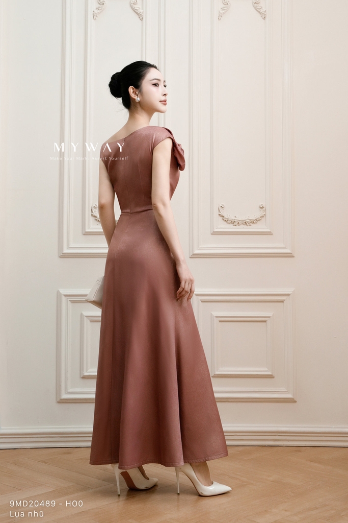 Đầm đuôi cá cổ biến kiểu và độ dài trên mắt cá chân mang đến vẻ đẹp gợi cảm nhưng vẫn thanh lịch. Thiết kế không tay, khóa sau, có lót tinh tế, sử dụng chất liệu nhập khẩu cao cấp: lụa nhũ ánh tím sang trọng kết hợp lụa hai da đỏ đô trơn mượt, tạo nên sự tương phản ấn tượng. Điểm nhấn là kết cấu váy hiện đại cùng phần hoa đính tinh xảo nơi cổ, tôn lên nét nữ tính và cuốn hút. Phần thân trên ôm sát gợi đường cong, trong khi chân váy đuôi cá bồng bềnh tạo dáng vẻ uyển chuyển. Tổng thể mang lại sự thoải mái, sang trọng và khả năng ứng dụng cao, phù hợp cho những buổi tiệc hoặc sự kiện đặc biệt.