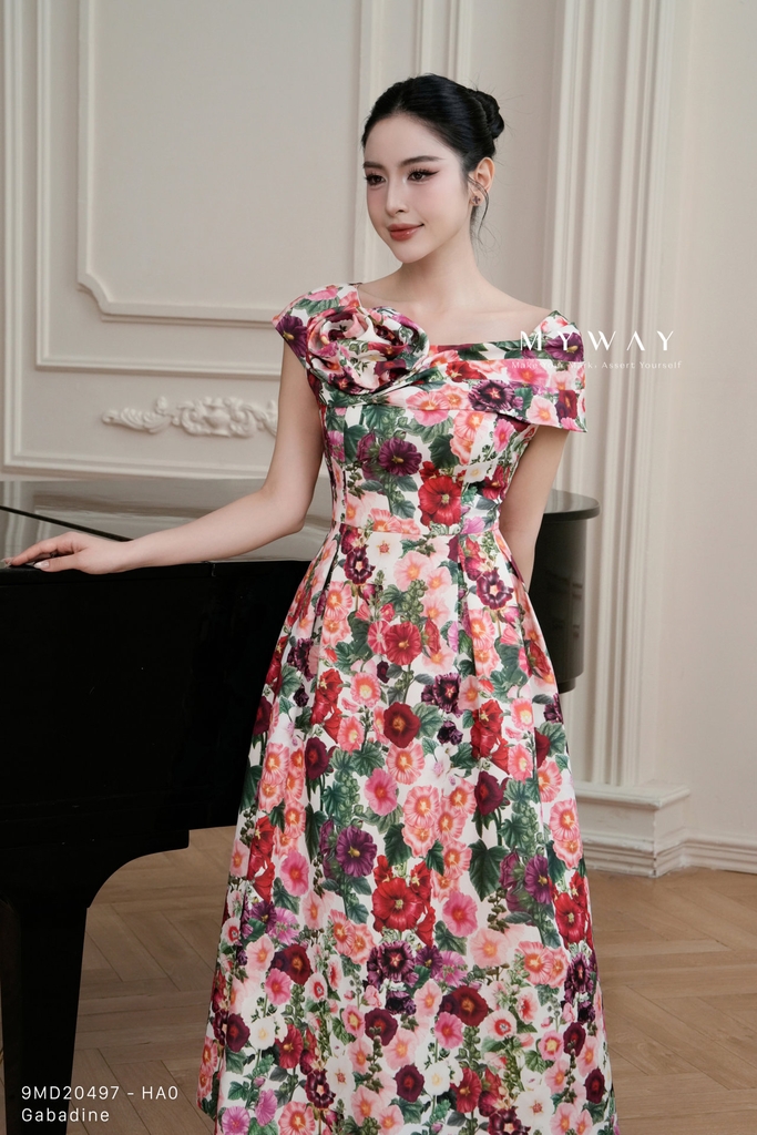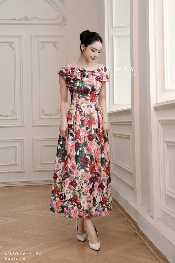 Đầm xòe dáng trên ôm dưới xòe, cổ biến kiểu, dài qua bắp chân mang đến vẻ đẹp nữ tính và duyên dáng. Thiết kế không tay, khóa sau tiện lợi, có đệm ngực, túi và lót giúp người mặc thoải mái, tự tin trong mọi hoạt động. Chất liệu Gabadine nhập khẩu cao cấp giữ phom dáng chuẩn chỉnh, bền đẹp và sang trọng. Điểm nhấn nằm ở kết cấu váy tinh tế cùng họa tiết hoa nền trắng phối hoa tím đỏ sắc nét, mang đến sự cuốn hút nổi bật. Phom dáng thanh lịch, dễ mặc, dễ phối đồ, giúp tôn nét hiện đại và quyến rũ cho người mặc.