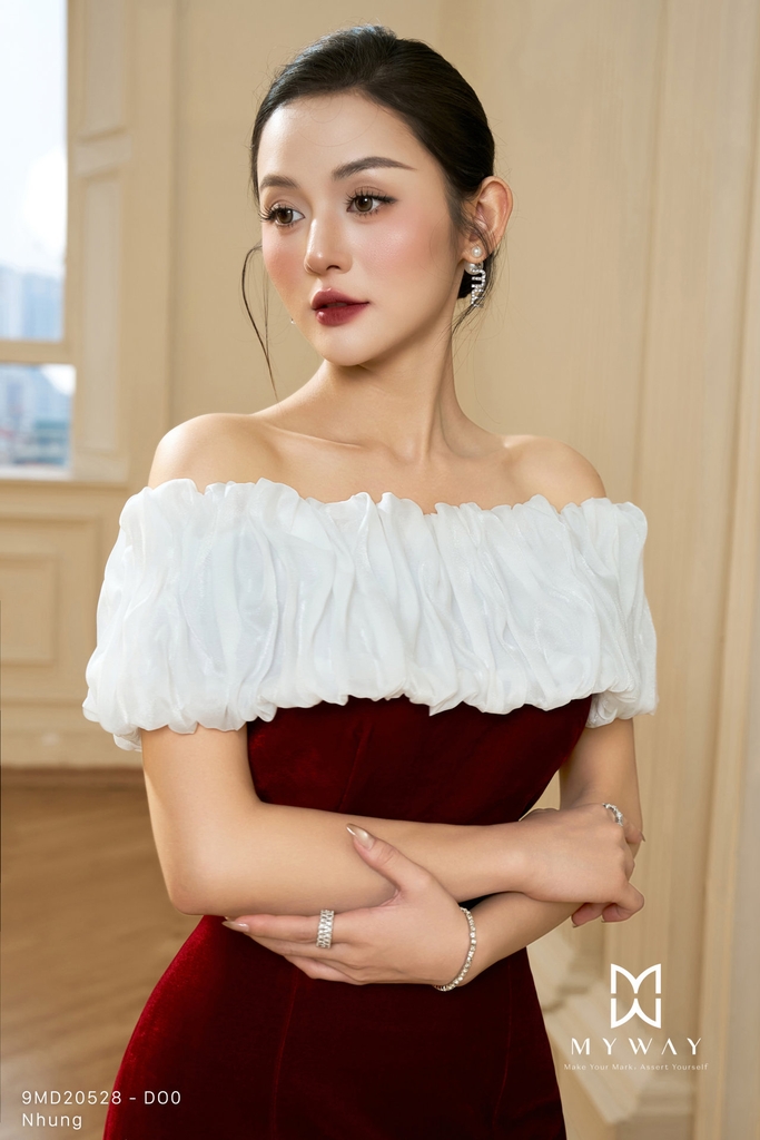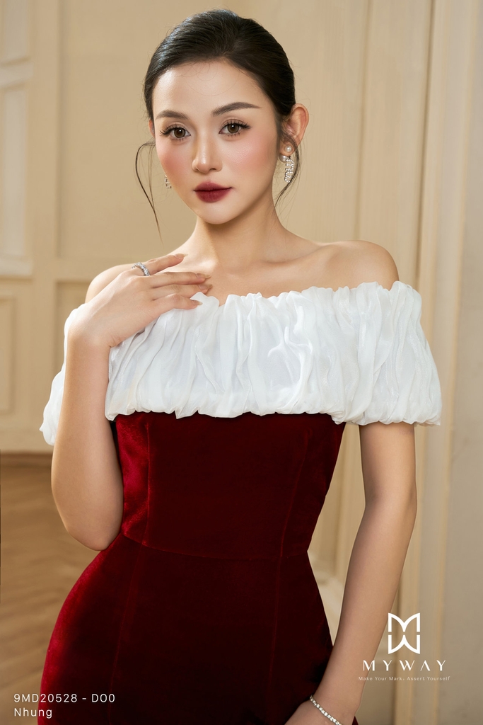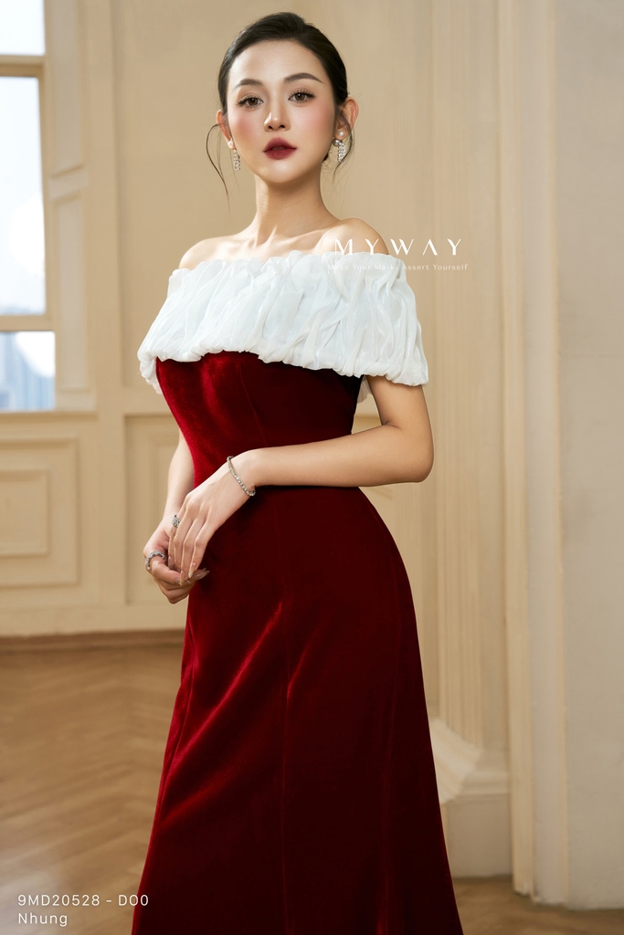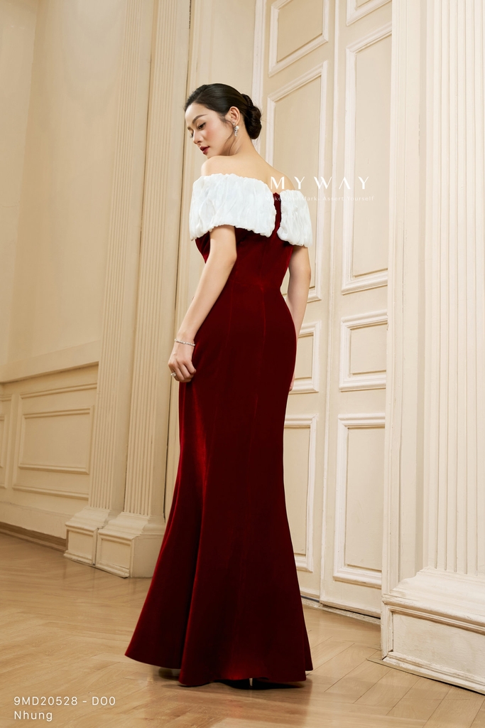 Đầm đuôi cá dài trên mắt cá chân, cổ biến kiểu, không tay, không túi và có lót, được thiết kế từ chất liệu nhung nhập khẩu cao cấp đã qua xử lý, mang đến phom dáng quyến rũ và hiện đại. Chiếc đầm nổi bật với phom đuôi cá mềm mại, kết hợp khăn choàng ngoài tạo điểm nhấn sang trọng, tôn lên đường cong cơ thể. Tông đỏ nổi bật giúp người mặc thu hút ánh nhìn, đồng thời vẫn giữ được vẻ thanh lịch và phong cách hiện đại. Thiết kế đem lại sự thoải mái cho thượng khách cùng khả năng phối đồ linh hoạt trong nhiều dịp khác nhau.