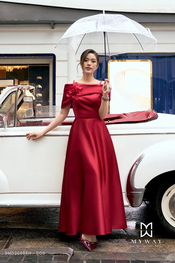 Đầm xòe thiết kế trên ôm dưới xòe với cổ biến kiểu cách điệu, chiều dài qua bắp, có túi tiện lợi và có lót mang lại sự thoải mái, kín đáo khi mặc; sản phẩm nổi bật với hai gam màu đỏ đô và xanh lá cây, trong đó đỏ đô mang sắc trầm ấm sang trọng, tôn da và tạo vẻ quyến rũ nổi bật, còn xanh lá cây đem đến cảm giác tươi mới, hiện đại và đầy sức sống. Đầm được thiết kế từ chất liệu Taffeta nhập khẩu cao cấp đã qua xử lý, bề mặt vải có độ bóng nhẹ, đứng phom và giữ dáng chuẩn chỉnh, giúp tổng thể lên form quyến rũ và thanh lịch. Điểm nhấn nằm ở phom dáng hài hòa kết hợp cùng chất liệu cao cấp và chi tiết hoa đính tinh tế, tạo chiều sâu và sự cuốn hút cho thiết kế. Sản phẩm mang lại sự thoải mái cho người mặc, toát lên phong cách hiện đại và khả năng phối phụ kiện linh hoạt trong nhiều dịp khác nhau.