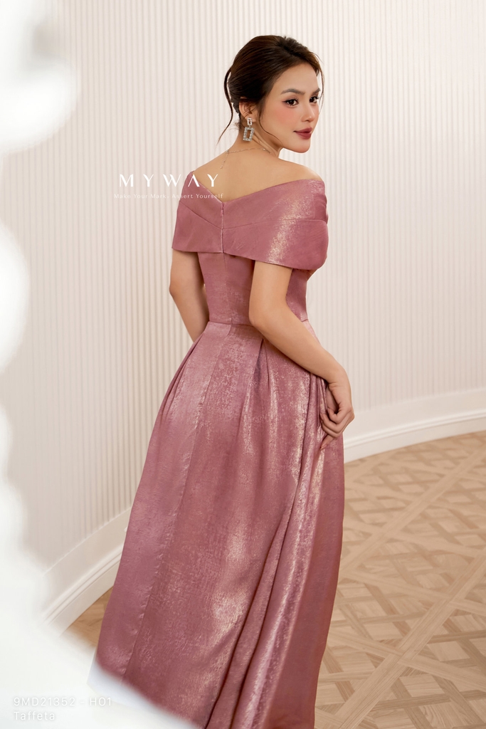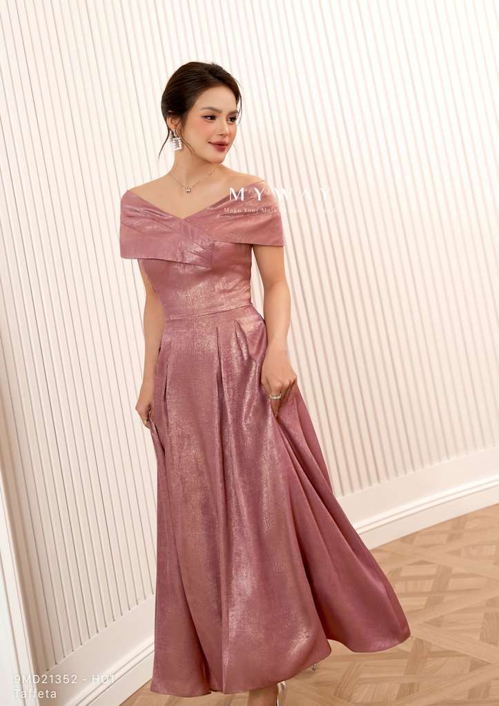 Đầm tiệc xòe xếp ly dáng trễ vai quyến rũ, thanh lịch, có chiều dài qua bắp, có túi và lót. Mẫu đầm khóa sau kết hợp chi tiết ôm eo quyến rũ để tăng thêm phần sành điệu, tiện dụng cho items. Điểm nhấn nằm ở chi tiết xếp ly thanh lịch cùng chất liệu Nhung Lyons đứng phom tạo ấn tượng cho items tiệc mang lại sự thoải mái cho thượng khách, toát lên vẻ thanh lịch, phong cách hiện đại, sang trọng, khả năng phối đồ cao trong dịp Thu - Đông