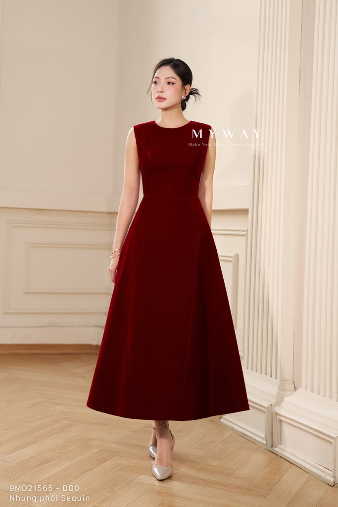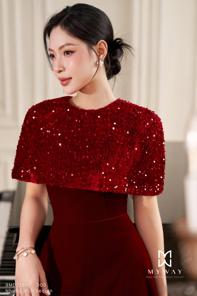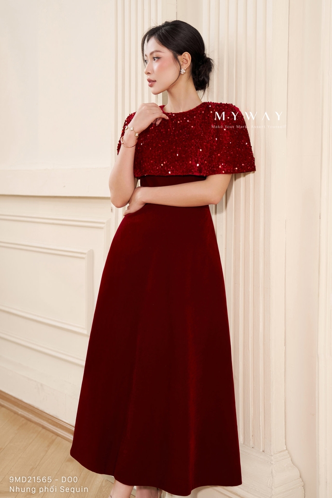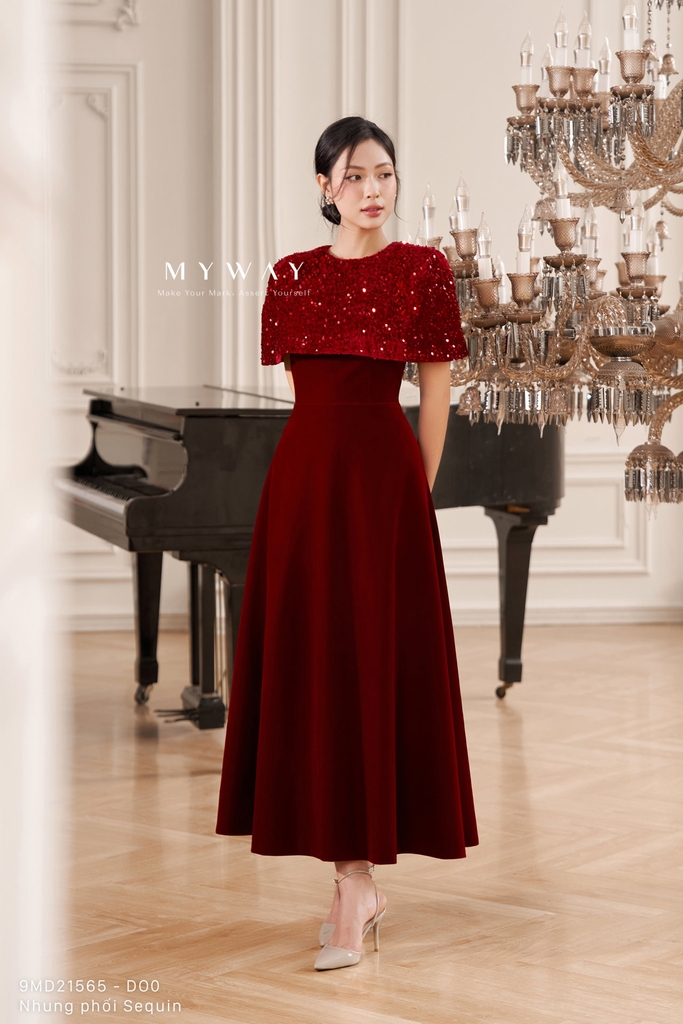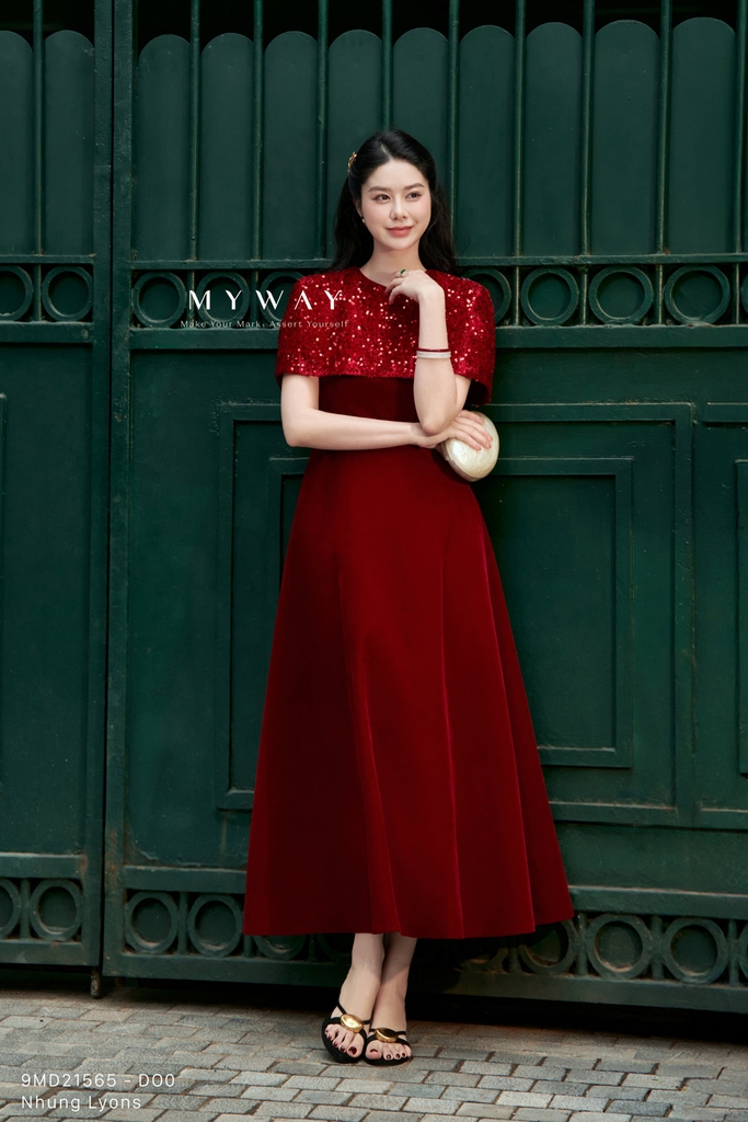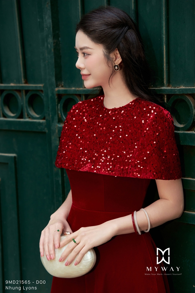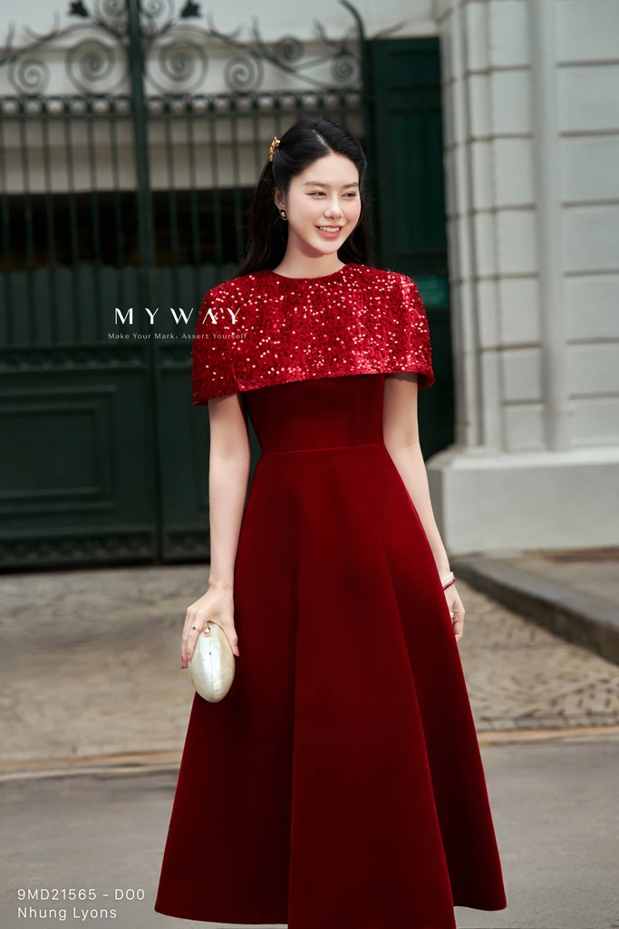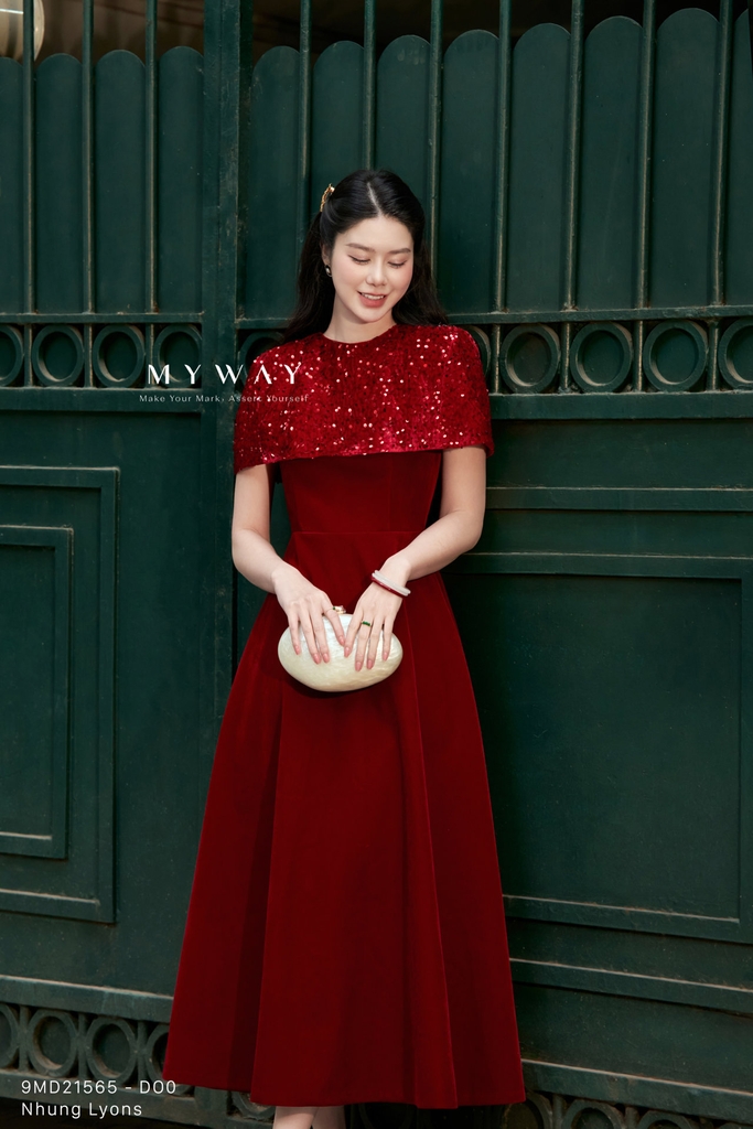 Đầm xòe với thiết kế trên ôm dưới xòe, cổ tròn và chiều dài qua bắp mang đến phom dáng nữ tính, thanh lịch và dễ mặc, đi kèm áo choàng khoác ngoài tạo nên tổng thể cách điệu, hiện đại. Sản phẩm có khóa sau, túi tiện dụng và lớp lót chỉn chu, được thiết kế từ chất liệu nhung nhập khẩu cao cấp đã qua xử lý giúp bề mặt mềm mại, lên phom chuẩn và tạo cảm giác thoải mái khi sử dụng. Điểm nhấn nằm ở phom dáng tinh tế kết hợp chất liệu vải, trong đó phần đầm nhung trơn được phối hài hòa cùng áo choàng ngoài bằng nhung kim sa lấp lánh, tách rời linh hoạt để có thể mặc theo hai kiểu khác nhau. Bảng màu sang trọng gồm đỏ đô trầm ấm, hồng nhung mềm mại và xanh tím than sâu lắng, mỗi gam màu đều mang sắc thái riêng, tôn lên vẻ quý phái và hiện đại, giúp che khuyết điểm cơ thể hiệu quả và dễ dàng phối hợp phụ kiện cho nhiều dịp khác nhau.