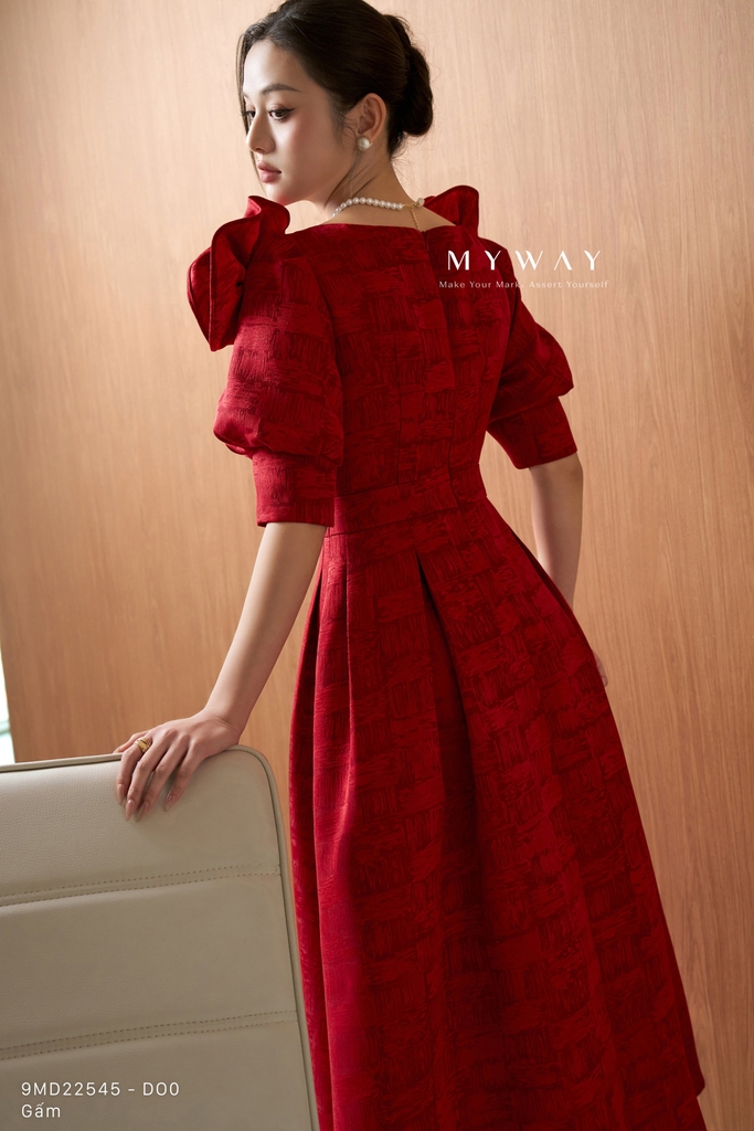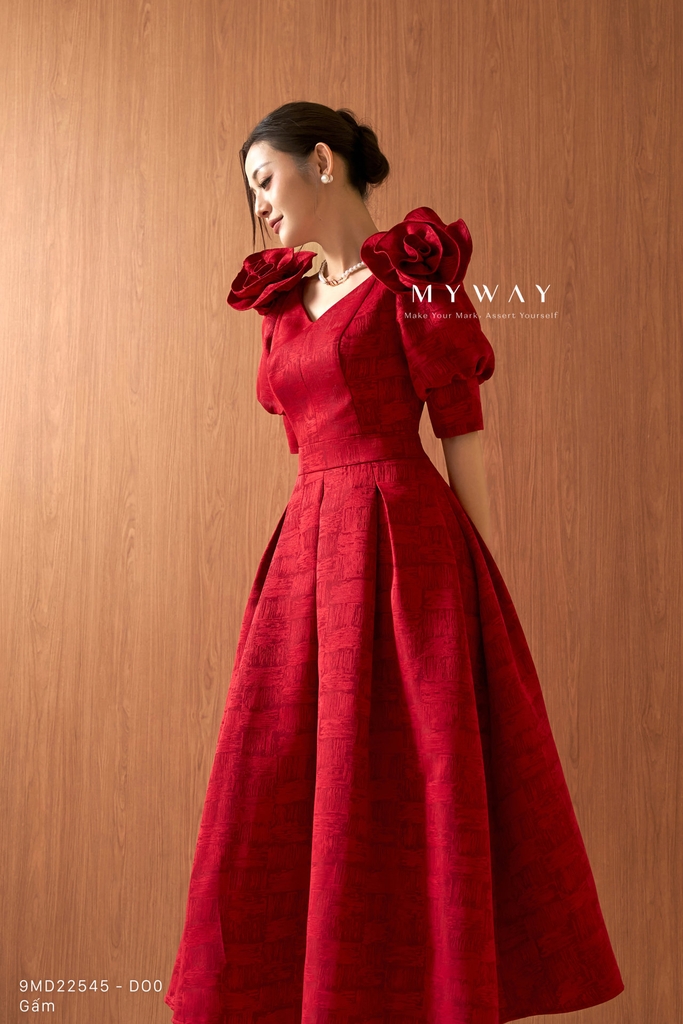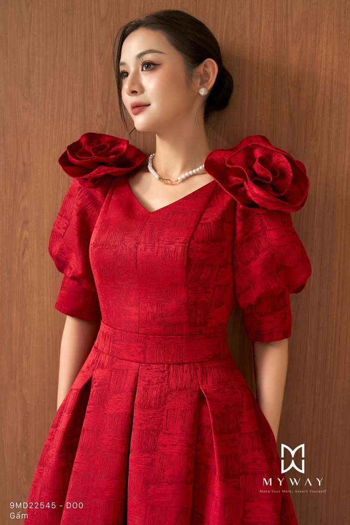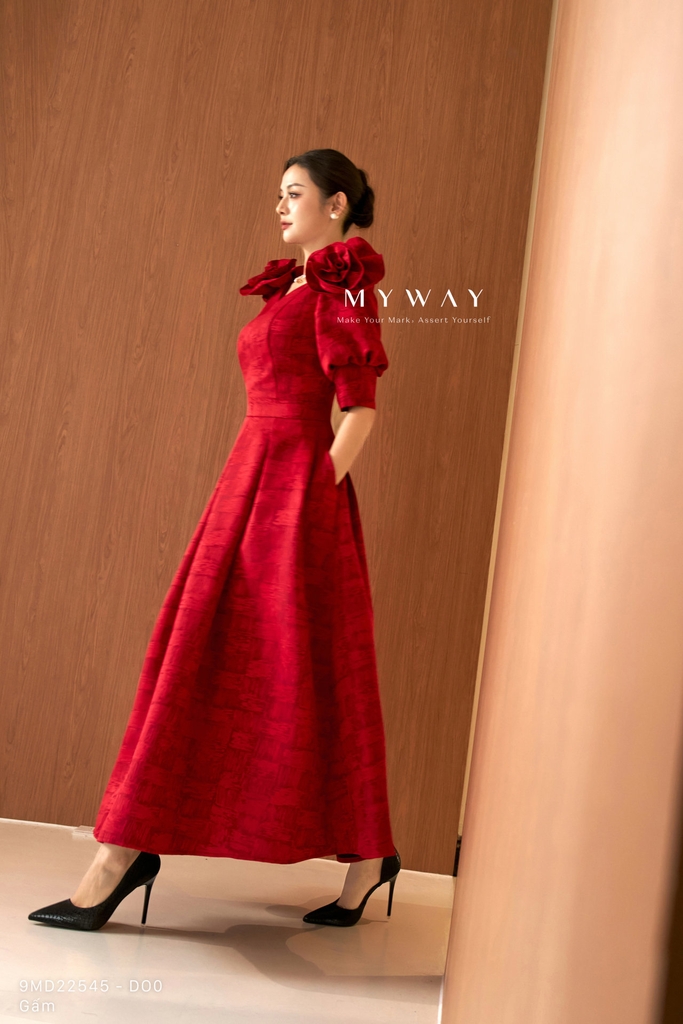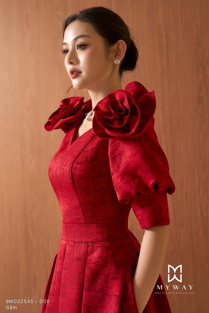 Đầm xòe được thiết kế theo phom trên ôm dưới xòe tôn dáng, cổ biến kiểu tinh tế, dáng dài qua bắp kết hợp tay lỡ mang lại vẻ thanh lịch và hiện đại, có túi và có lót tạo sự tiện dụng và thoải mái khi mặc. Đầm sử dụng chất liệu gấm nhập khẩu cao cấp đã qua xử lý, giữ phom chuẩn chỉnh. Điểm nhấn nổi bật nằm ở kết cấu váy tinh xảo, tay áo thiết kế biến kiểu kết hợp chi tiết hoa đính tạo hiệu ứng sang trọng, cùng họa tiết và chất liệu vải sắc nét, nổi bật. Phần chân váy xòe xếp ly mềm mại giúp che khuyết điểm cơ thể hiệu quả. Tông màu đỏ hỗn hợp cuốn hút với sắc đỏ chủ đạo được pha trộn tinh tế giữa các gam đỏ trầm và đỏ tươi, tạo chiều sâu màu sắc, giúp tổng thể trang phục trở nên nổi bật, sang trọng, toát lên phong cách hiện đại và dễ dàng phối đồ trong nhiều dịp khác nhau.