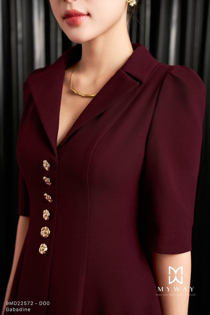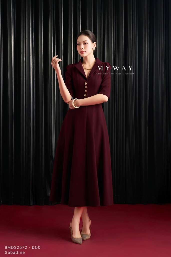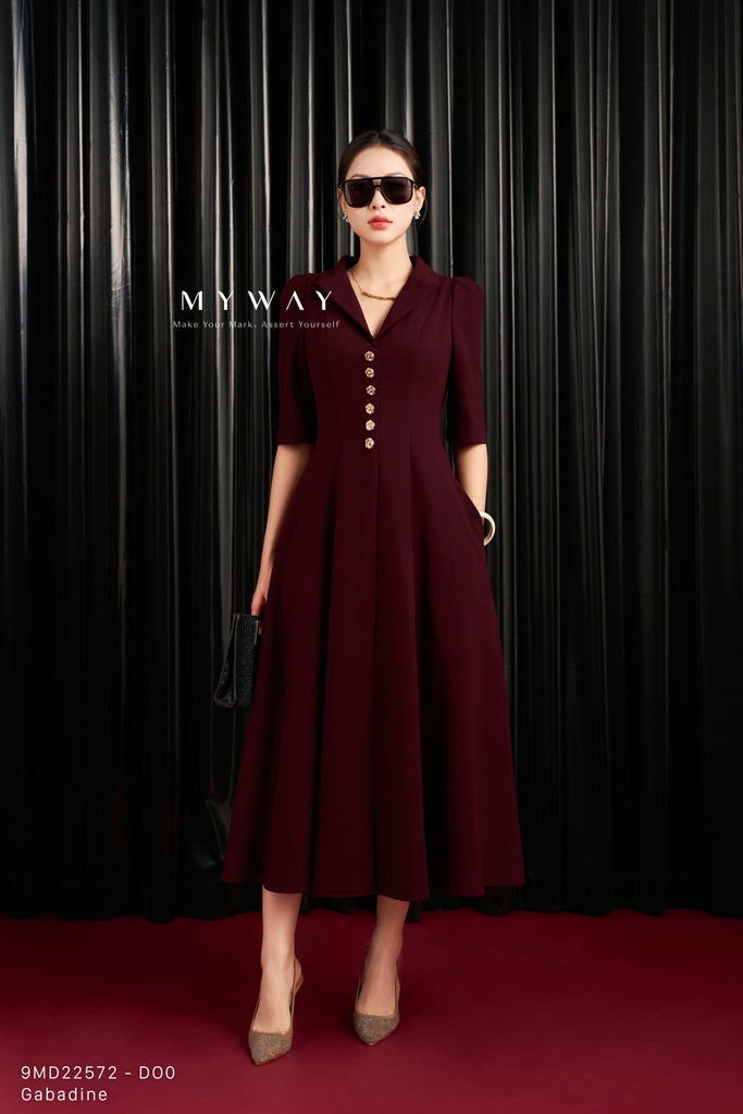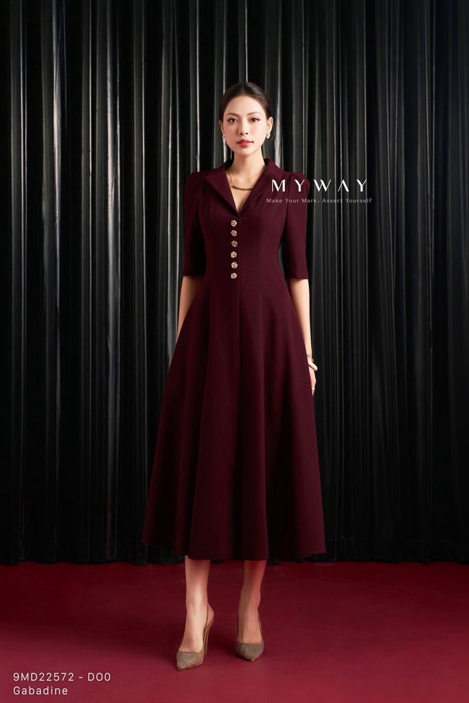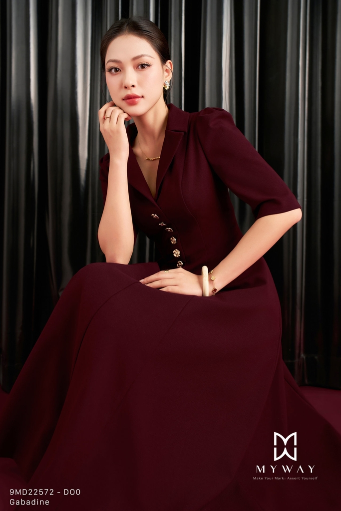 Đầm xòe thiết kế trên ôm dưới xòe với cổ biến kiểu tinh tế, chiều dài qua bắp, tay lỡ thanh lịch, có túi tiện lợi và có lót mang đến sự thoải mái, kín đáo khi mặc; sản phẩm nổi bật với ba gam màu nâu đỏ, hồng và cam, trong đó nâu đỏ mang sắc trầm ấm sang trọng, hồng tạo cảm giác tươi tắn, nữ tính, còn cam rạng rỡ giúp tổng thể thêm phần nổi bật và trẻ trung; đầm được thiết kế từ chất liệu Gabadine nhập khẩu cao cấp đã qua xử lý, bề mặt vải mịn, có độ đứng phom tốt và lên dáng chuẩn chỉnh, tôn đường cong cơ thể một cách tinh tế; điểm nhấn nằm ở kết cấu váy hài hòa cùng chi tiết khuy trang trí nổi bật, tạo chiều sâu và nét cuốn hút riêng cho thiết kế; phom váy dễ mặc, khéo léo che khuyết điểm cơ thể, mang lại sự tự tin và phong cách hiện đại với khả năng phối đồ linh hoạt trong nhiều dịp khác nhau.