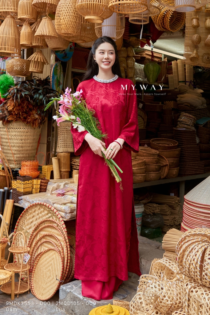 Áo dài dáng suông vừa với cổ tròn thanh thoát, chiều dài qua mắt cá chân và tay dài mang đến vẻ mềm mại, duyên dáng nhưng vẫn hiện đại. Thiết kế không lót giúp trang phục giữ được độ nhẹ và rủ tự nhiên, tôn lên phom dáng suông dễ mặc, phù hợp nhiều vóc dáng. Sản phẩm được thiết kế từ chất liệu lụa họa tiết nhập khẩu cao cấp đã qua xử lý, bề mặt vải mềm mịn, giữ phom chuẩn và tạo cảm giác thoải mái khi mặc. Gam màu đỏ đun trầm ấm, sang trọng kết hợp cùng họa tiết vải tinh tế, dây cổ trang trí và chi tiết hoa tạo điểm nhấn nổi bật, giúp tổng thể thêm phần cuốn hút và nữ tính. Thiết kế toát lên vẻ thanh lịch, phong cách hiện đại, dễ phối phụ kiện và phù hợp với nhiều dịp khác nhau.