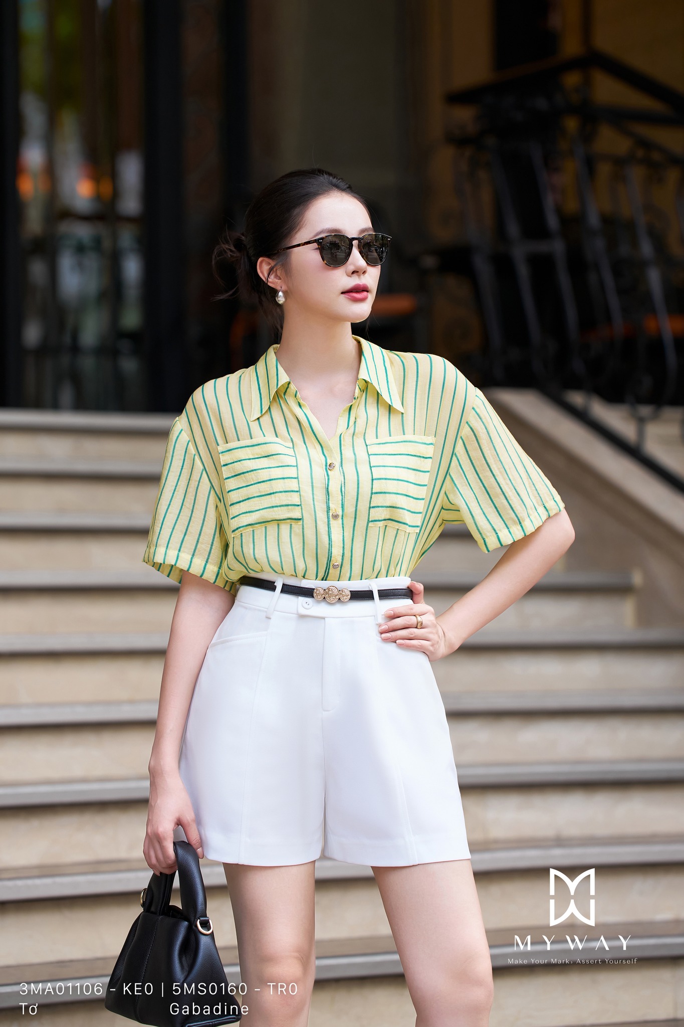 Chiếc quần short trắng phối cùng áo sơ mi sọc xanh vàng là sự kết hợp của mùa hè và sự tươi mới. Nó như ánh sáng phản chiếu trên bậc thềm đá – rực rỡ và đầy sức sống.