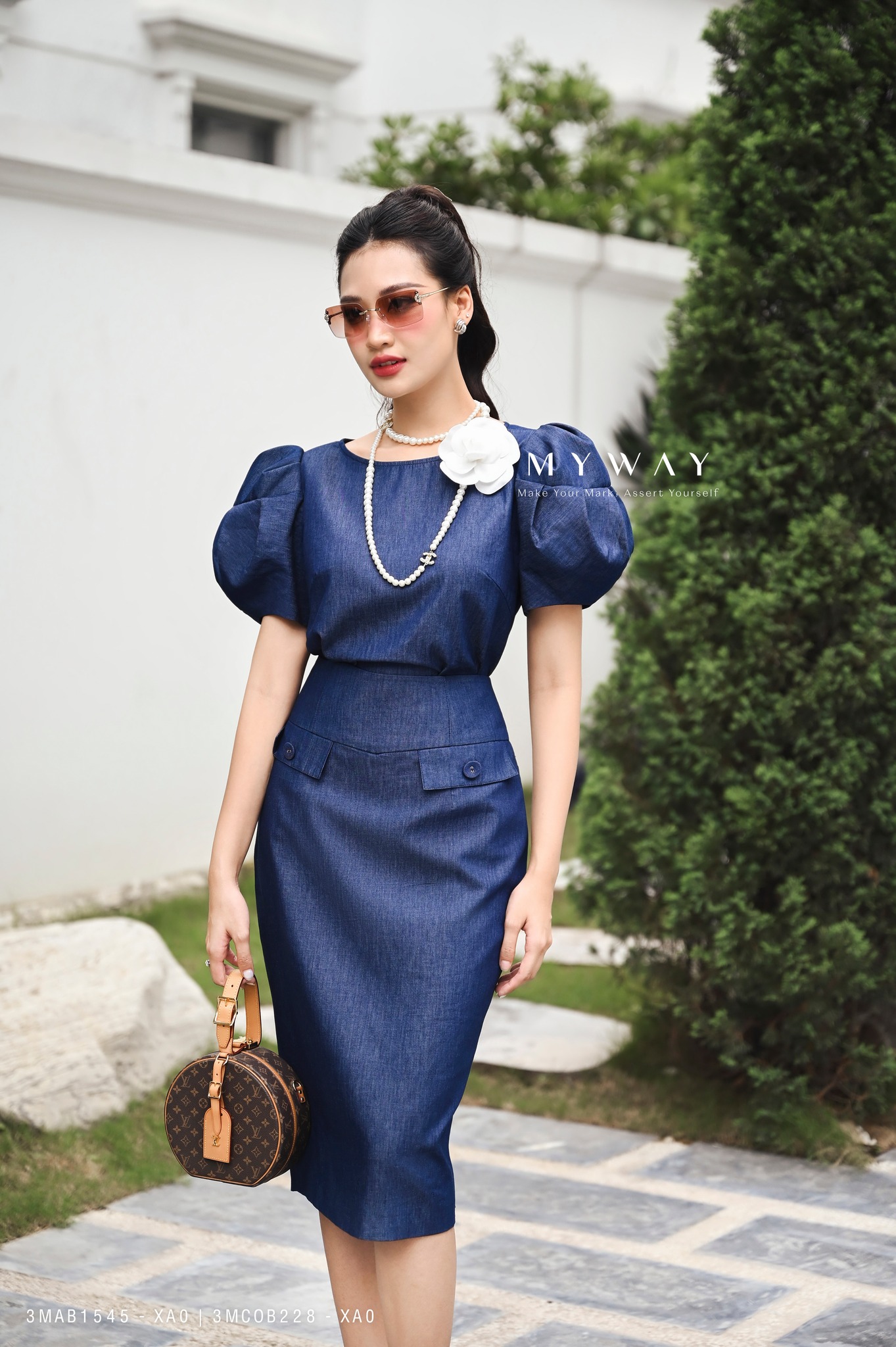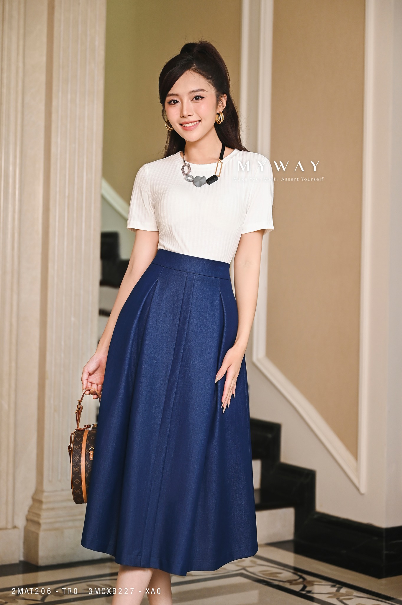Chân váy chambray denim mỏng nhẹ phối cùng một chiếc T-shirt trắng basic tạo nên tổng thể nổi bật mà vẫn hài hòa, phù hợp với nhiều sự kiện khác nhau là gợi tý hôm nay My Way dành cho quý cô.