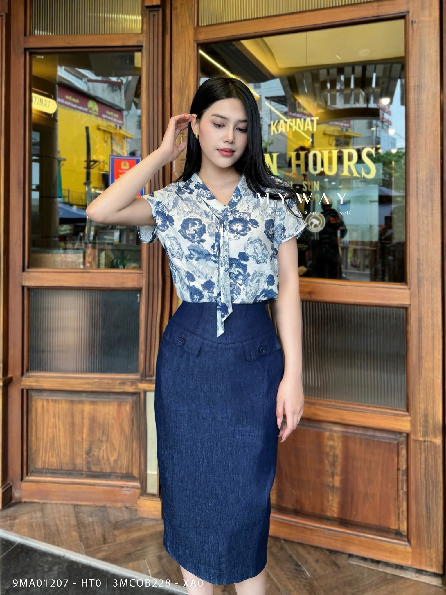 Sơ mi ngắn tay mềm mại in chìm hoa sống động với sắc xanh mát mắt làm dịu đi sự oi nóng của mùa hè, nay được My Way tinh tế biến tấu thêm nơ rủ tại phần cổ áo - thiết kế gọi tên tinh thần tối giản thanh lịch.