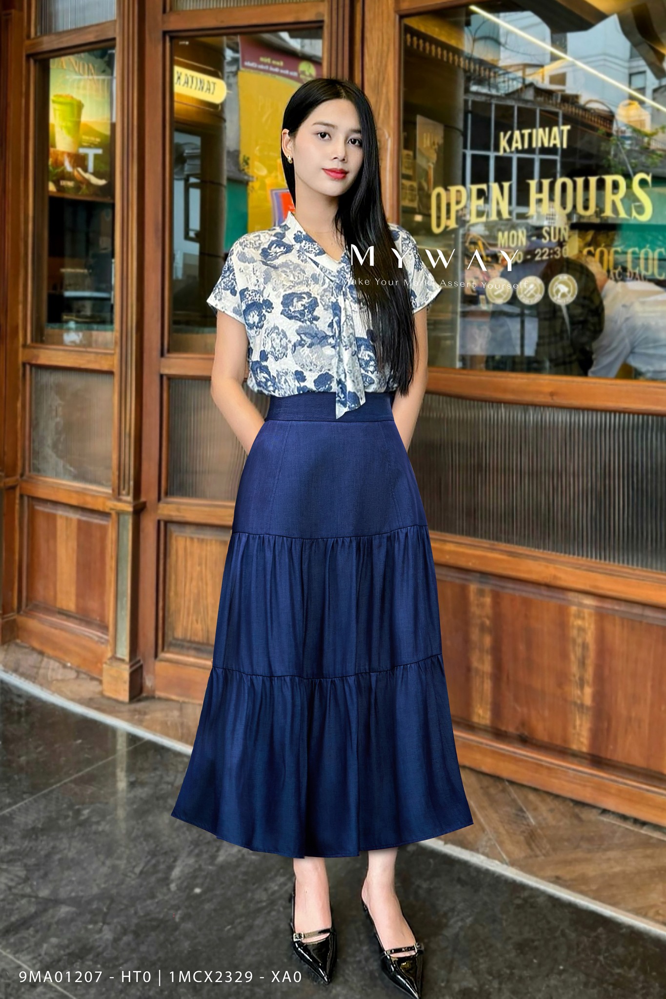 Phối cùng chân váy xòe nhún tầng Cotton Denim Chambray tạo điểm nhấn tone-sur-tone cho Outfit công sở được hoàn chỉnh.