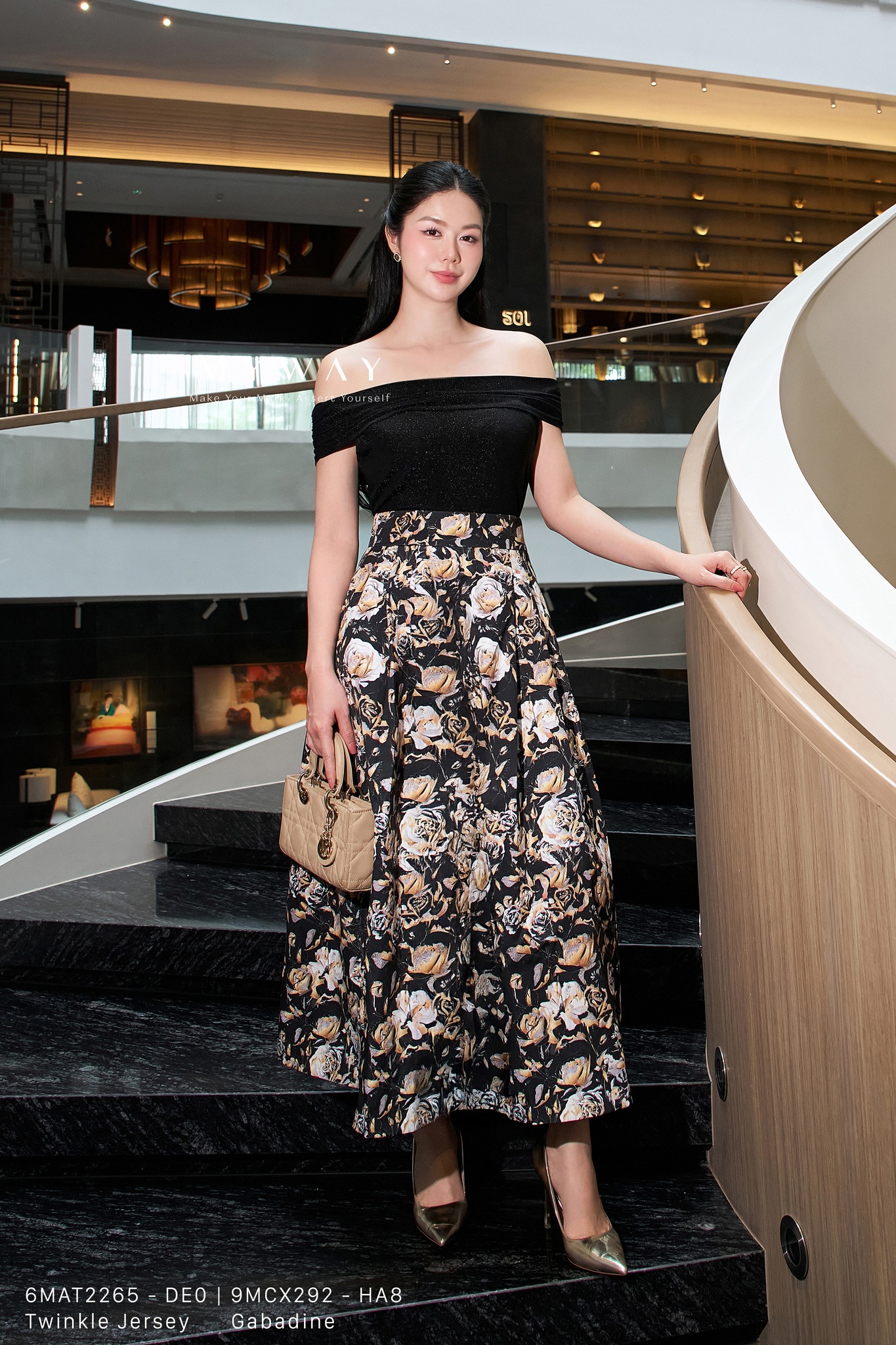 Nhẹ nhàng mà đắm say, quý cô khoác lên mình bản phối áo trễ vai đen – chân váy trắng in họa tiết cổ điển, tựa nàng thơ giữa khu vườn thanh tĩnh. Sự hòa quyện giữa sắc đen quyến rũ và tông trắng tinh khôi khắc họa một hình ảnh yêu kiều, vừa thanh tao vừa thời thượng, như một nốt nhạc chạm đến cảm xúc người đối diện.