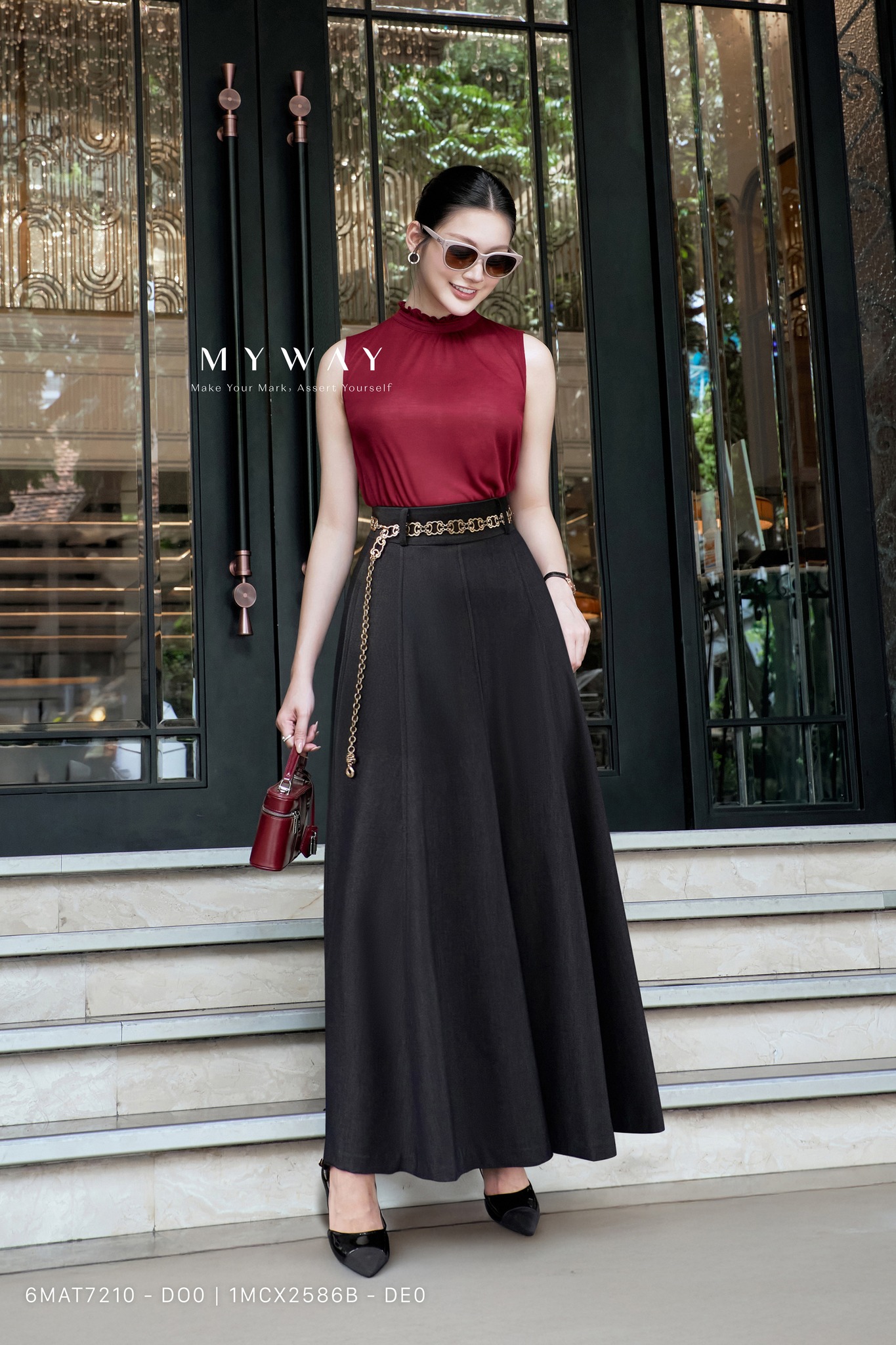 Sự đối lập giữa sọc ngang trẻ trung và sắc đỏ rượu vang quyền lực mở ra một bản phối đậm chất thời trang. Chất liệu cotton mềm mại được xử lý khéo léo trong thiết kế chân váy dài xếp ly, vừa giữ nếp phom dáng chuẩn, vừa tạo độ bay bổng trong từng bước di chuyển. Chiếc thắt lưng mảnh ánh kim là điểm nhấn tinh xảo, hoàn thiện phong cách thanh lịch và cuốn hút.