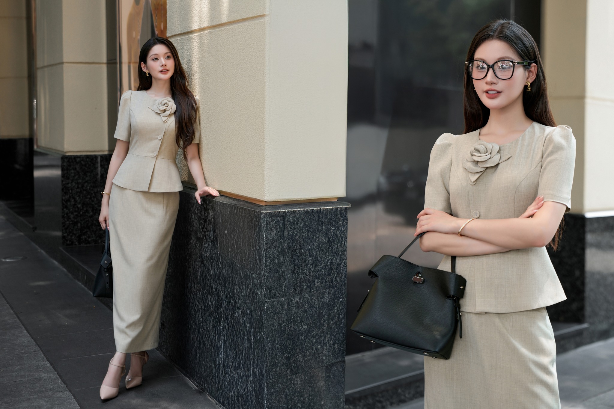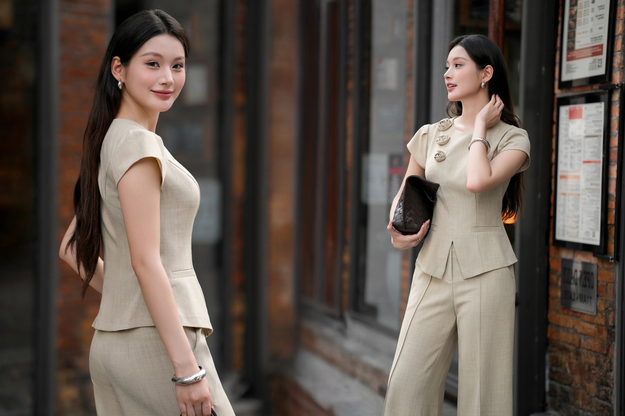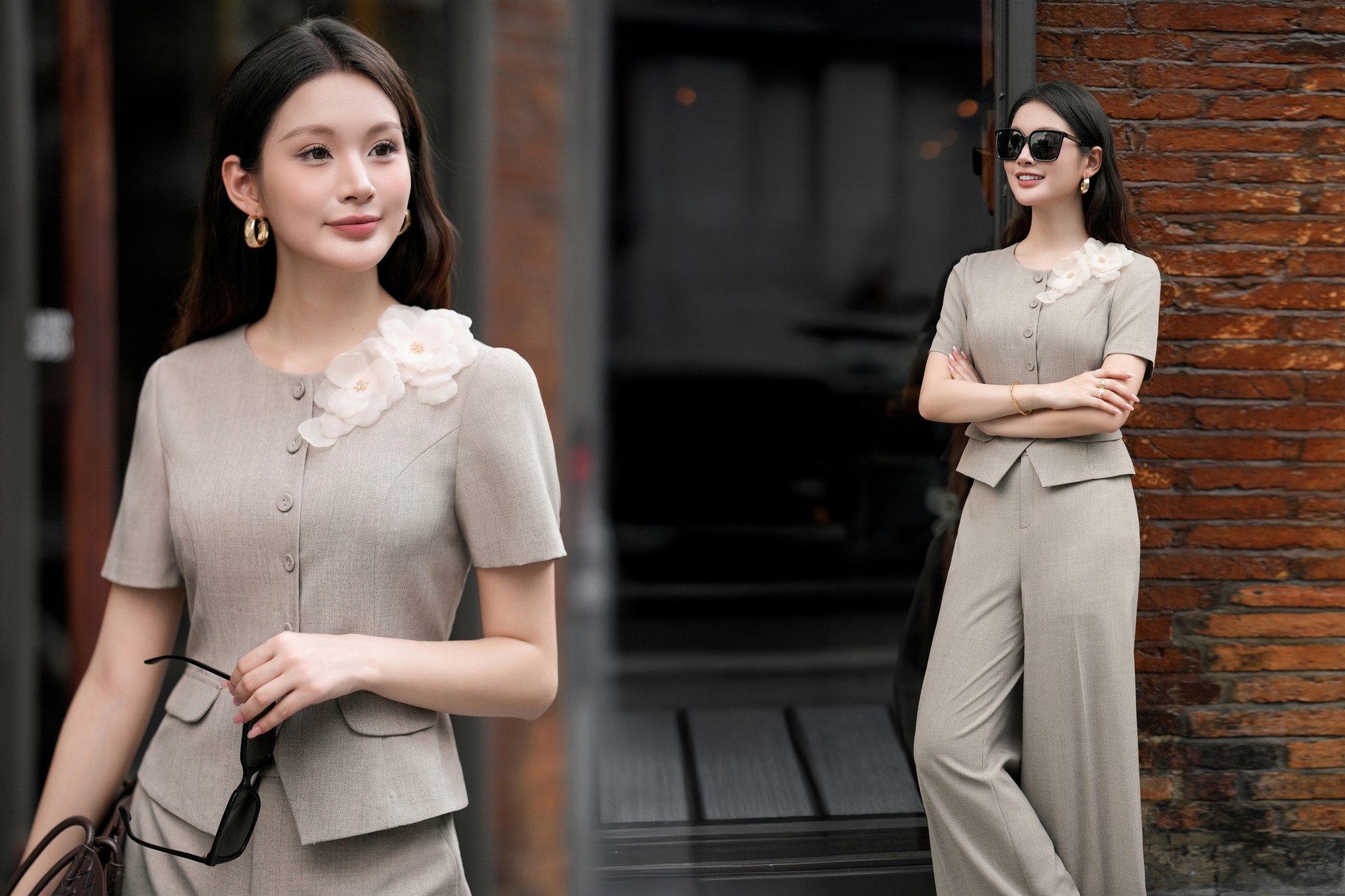 Nhẹ nhàng và nữ tính, set vest màu be thiết kế cộc tay với điểm nhấn hoa nổi ở cầu vai, mang lại sự thanh thoát cho tổng thể. Chất liệu slub linen tự nhiên càng làm bật lên vẻ sang trọng thoải mái, phù hợp cho những buổi hẹn café hoặc môi trường công sở hiện đại.
