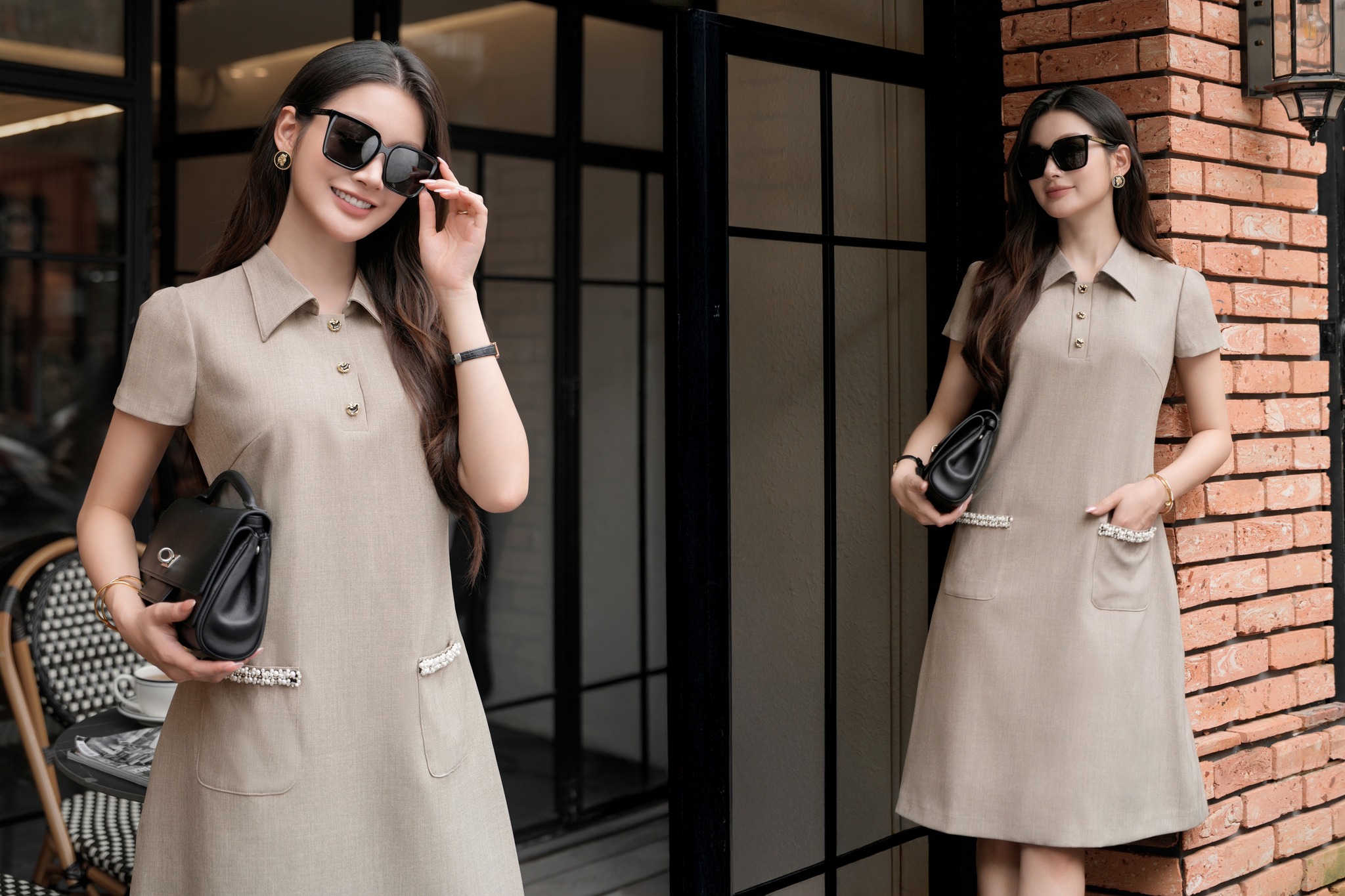 Thanh nhã và thời thượng với thiết kế váy suông chữ A gam beige trung tính, điểm xuyết chi tiết túi viền ngọc trai tinh xảo. Phom váy nhẹ nhàng che khuyết điểm cơ thể, tôn lên vẻ thanh thoát và nữ tính, đặc biệt khi kết hợp cùng giày cao gót mũi nhọn đen ánh vàng đầy sang trọng.