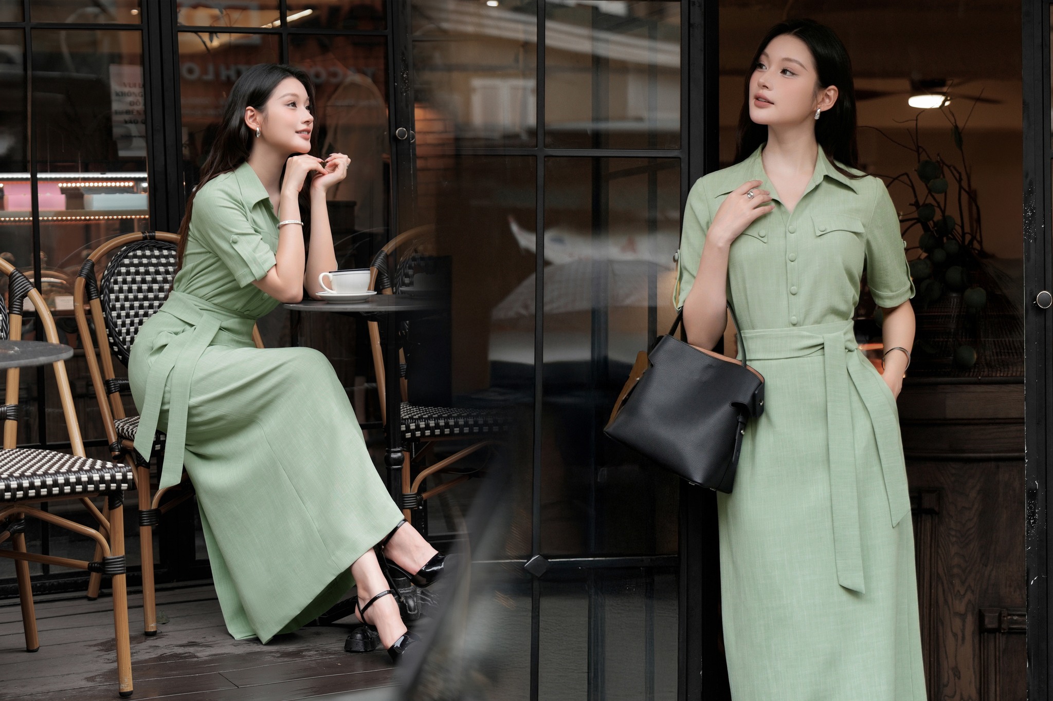 Nữ tính và thanh lịch, thiết kế đầm sơ mi dáng dài trên nền slub linen nhẹ mát mang lại sự duyên dáng tự nhiên. Thắt lưng bản dài tạo hiệu ứng eo thon gọn, trong khi gam xanh lá dịu dàng giúp tổng thể trở nên tinh khôi, phù hợp cho cả công việc lẫn dạo phố.