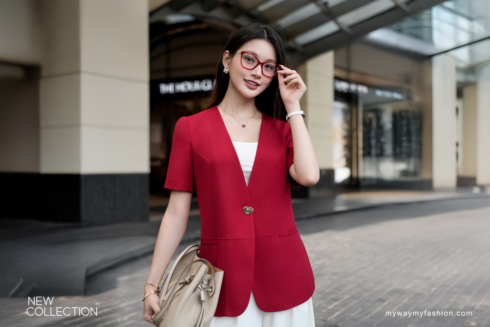Quyến rũ và quyền lực, chiếc vest đỏ đô nổi bật trên nền gabardine khi phối cùng quần trắng dáng suông rủ nhẹ, tạo nên bản phối hài hòa giữa sự mạnh mẽ và nữ tính. Set đồ khẳng định phong thái tự tin, lý tưởng cho những quý cô yêu sự nổi bật tinh tế.