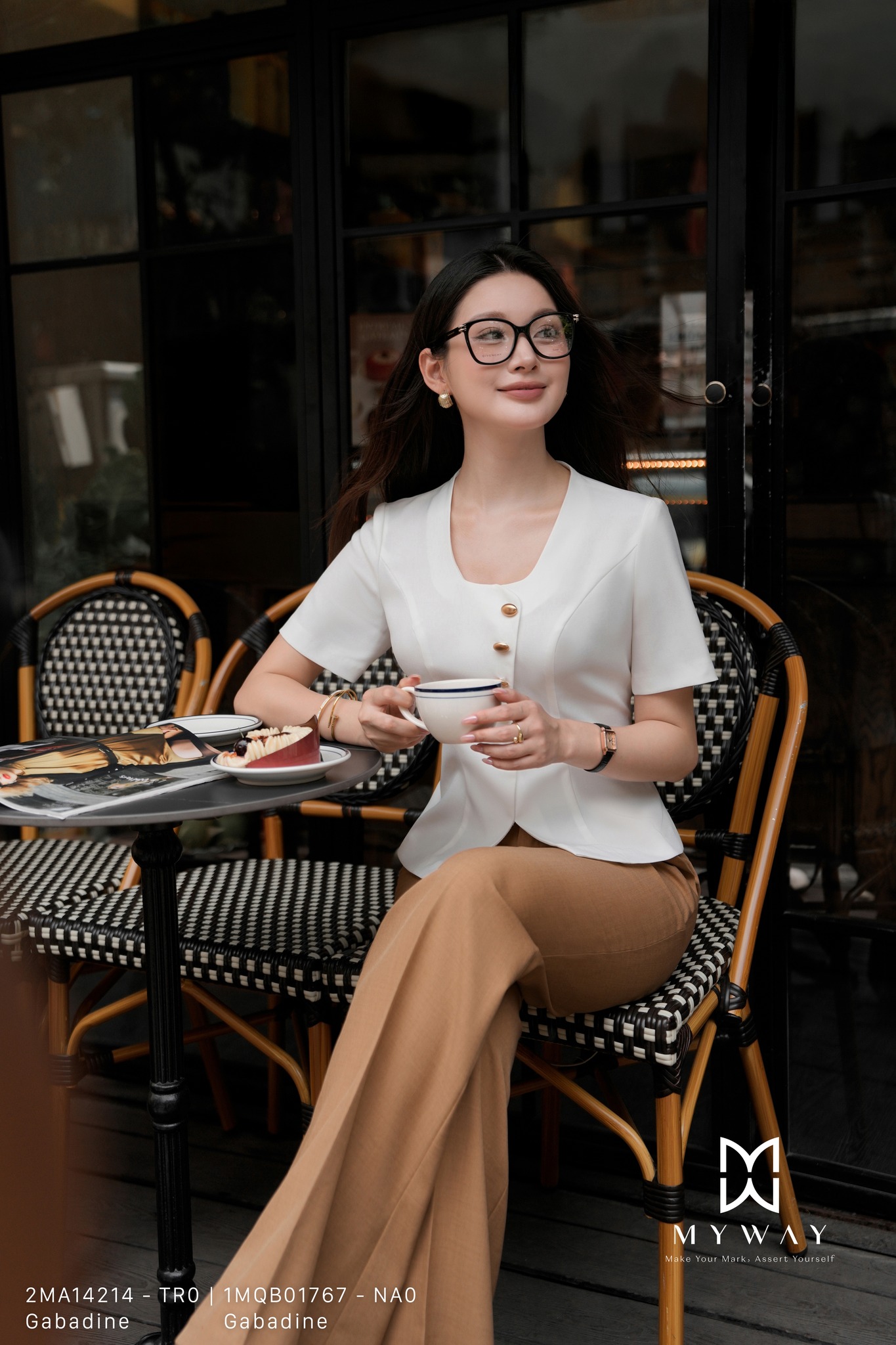 Thanh lịch nhưng không kém phần tinh tế với thiết kế áo cổ vuông tay ngắn điểm xuyết hàng cúc vàng sang trọng. Khi phối cùng quần tây ống rộng gam nâu thời thượng, set đồ vừa khéo léo tôn dáng, vừa mang đến vẻ ngoài hiện đại, duyên dáng, đặc biệt hoàn hảo khi kết hợp cùng phụ kiện tối giản.