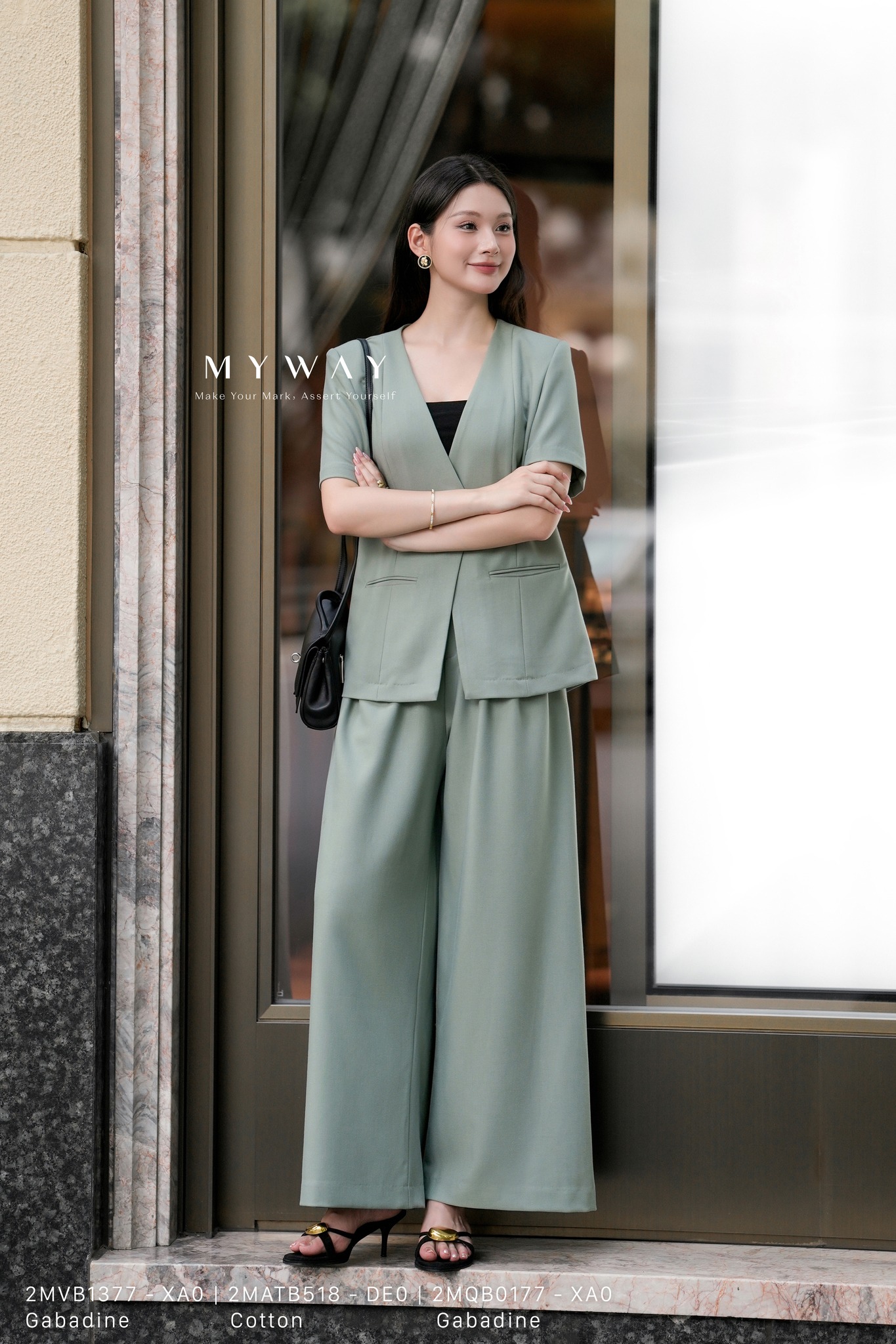 Tinh giản nhưng hiện đại, thiết kế vest ngắn tay kết hợp quần ống rộng rãi trên nền chất liệu gabardine cao cấp mang lại sự thanh lịch tuyệt đối. Gam xanh pastel dịu nhẹ giúp người mặc thêm phần trẻ trung, dễ dàng ứng dụng từ công sở đến dạo phố, đặc biệt tôn lên vóc dáng khi phối cùng giày cao gót.