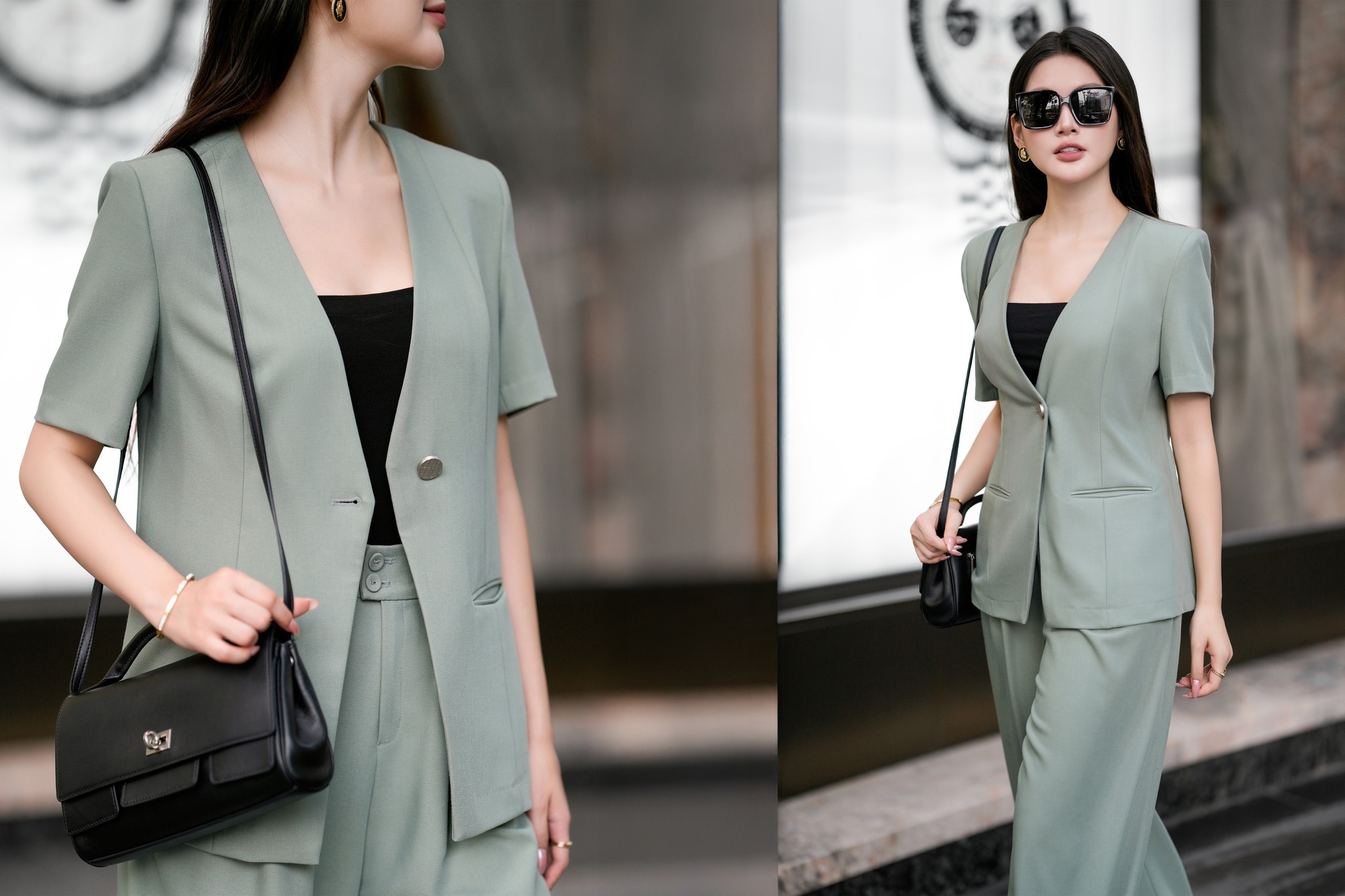 Tươi trẻ nhưng vẫn tinh tế, bộ vest xanh ngọc pastel được may trên chất liệu slub linen thoáng mát, nhẹ nhàng. Thiết kế vest có hoa nổi bản lớn mang lại sự duyên dáng, kết hợp quần suông dài giúp người mặc thêm phần thanh mảnh, phù hợp cả đi làm lẫn đi chơi.