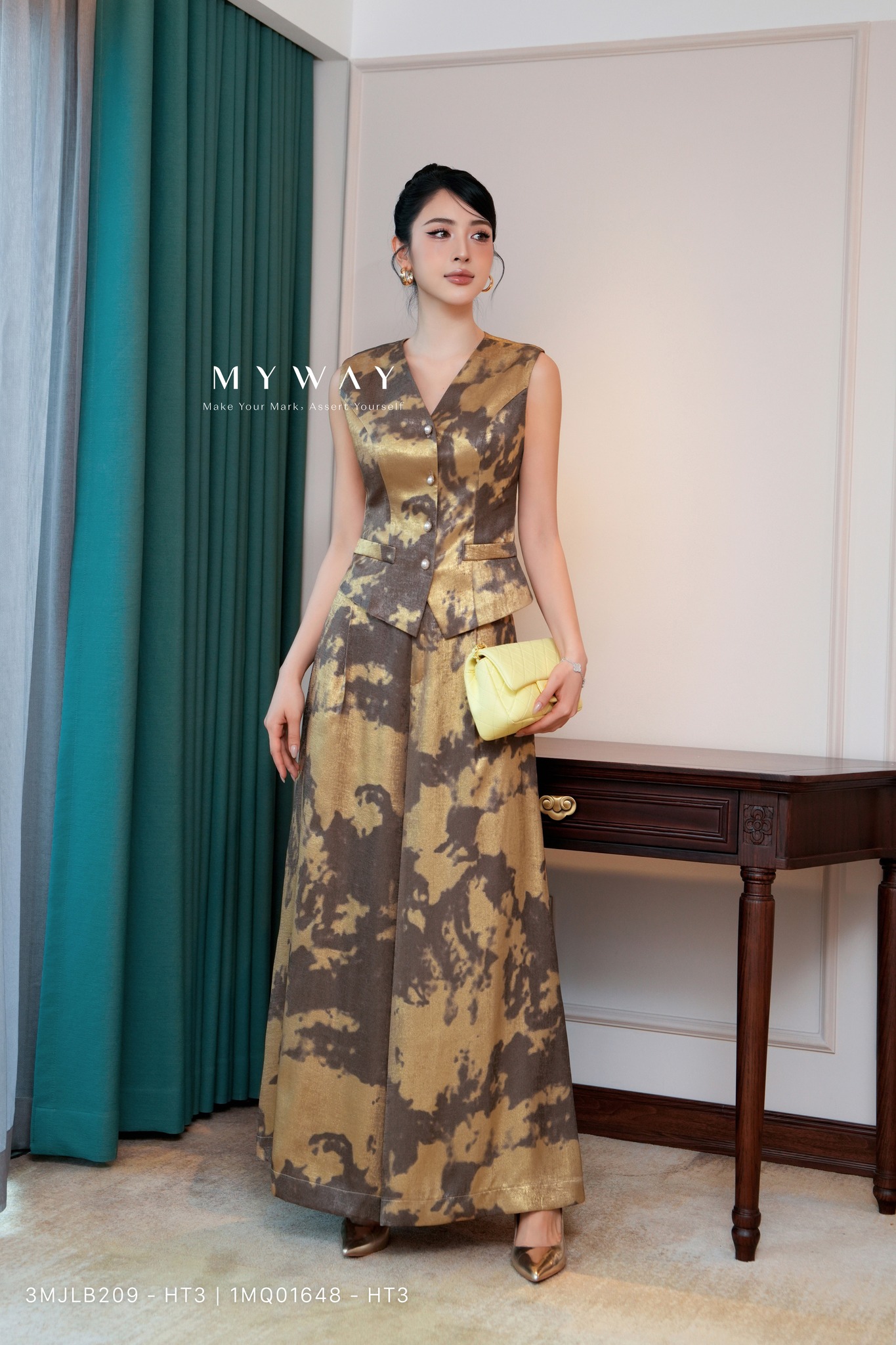 Tựa dải ngân hà rực rỡ, gile ánh vàng nâu hòa cùng họa tiết loang độc đáo, tạo nên một bản giao hưởng của sự huyền bí và sang trọng. Người mặc như bước ra từ bức tranh trừu tượng, kiêu hãnh và rạng ngời.