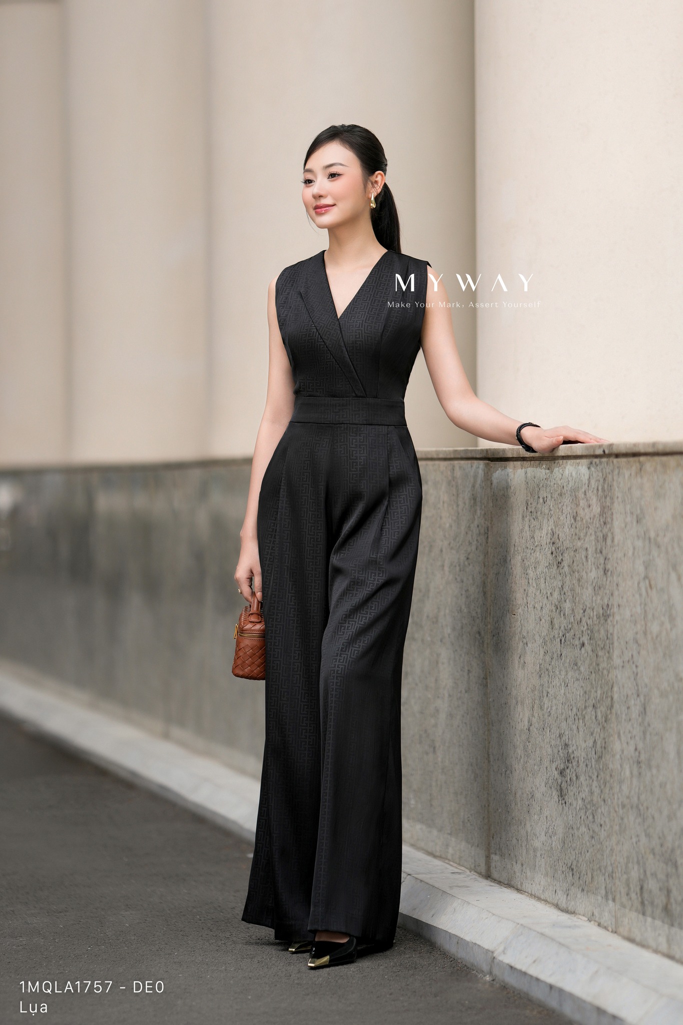 Bộ jumpsuit gile đen huyền bí như màn đêm sang trọng, đường cắt ôm gọn vừa đủ, để từng bước chân nàng trở thành vũ điệu của quyền lực và kiêu hãnh.