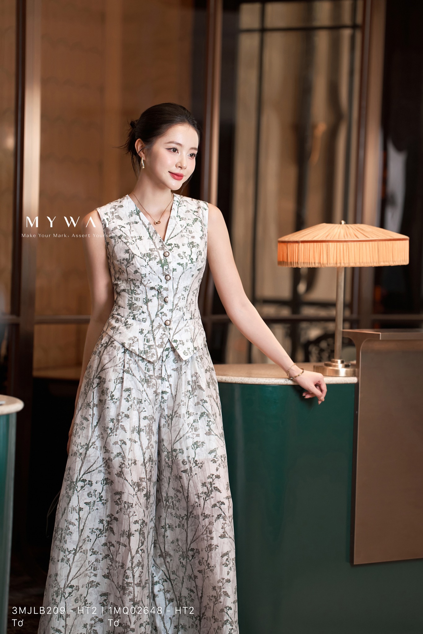 Chiếc gile họa tiết cành lá như khu vườn mùa xuân chạm vào tim người, dịu dàng, mong manh mà vẫn tràn đầy sức sống – một bản giao hưởng của thiên nhiên và nét kiêu sa.