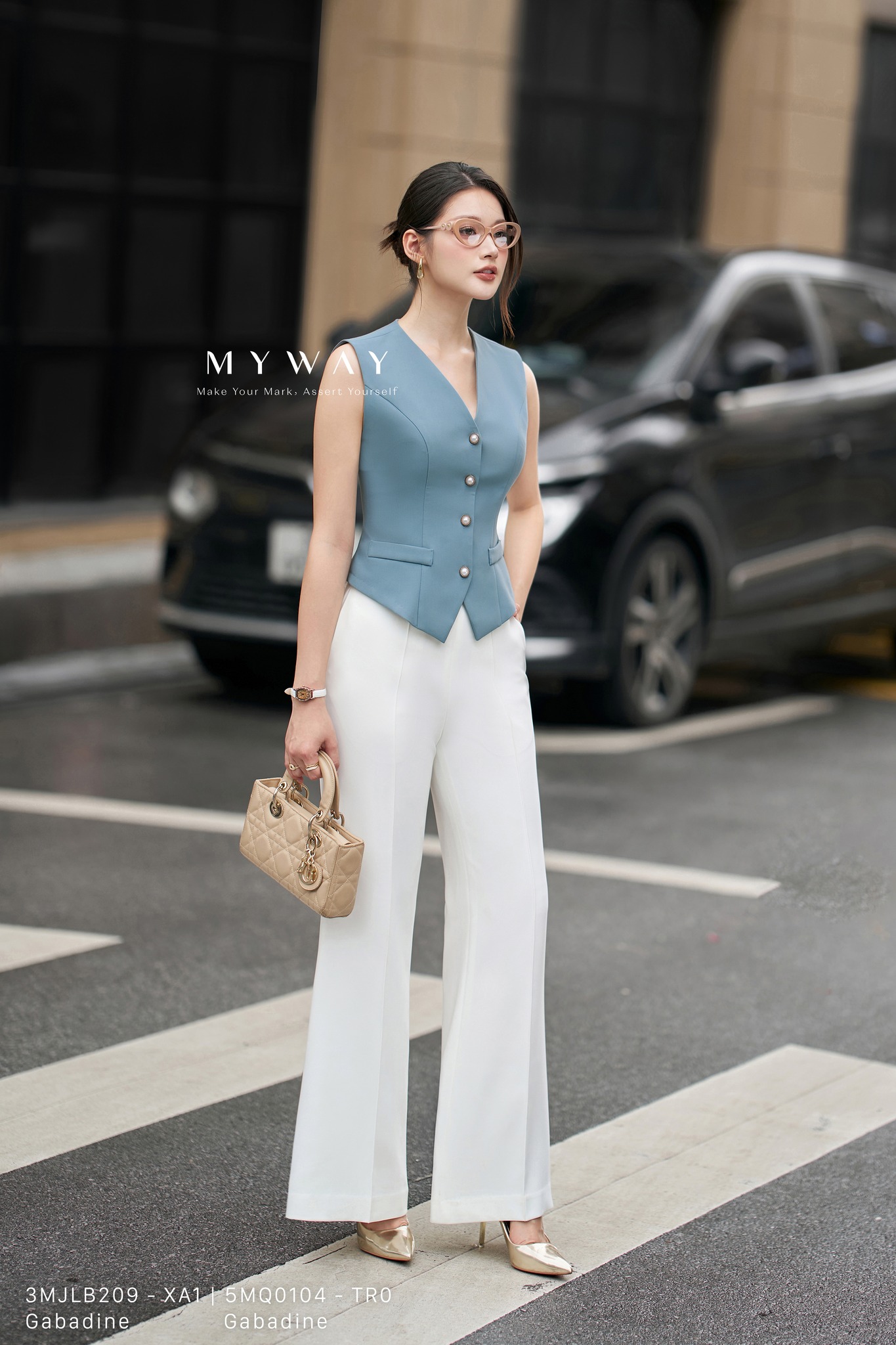 Chiếc gile xanh thanh lịch như làn gió sớm, ôm trọn vóc dáng đầy tự tin. Đi cùng quần trắng bay bổng, cả bộ trang phục gợi lên cảm giác vừa hiện đại, vừa tinh khôi – như một bản hòa ca của sự sang trọng nơi phố thị.