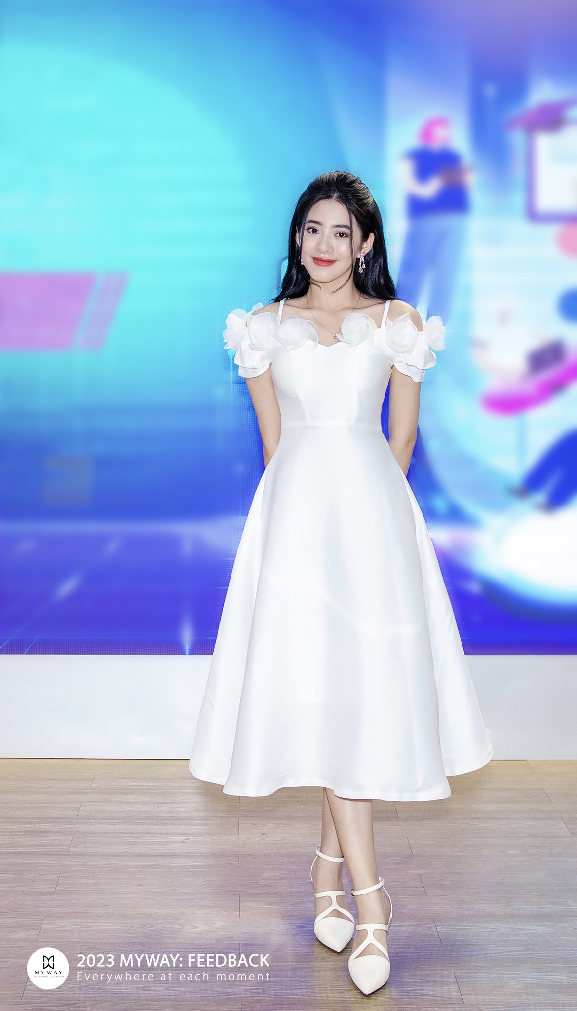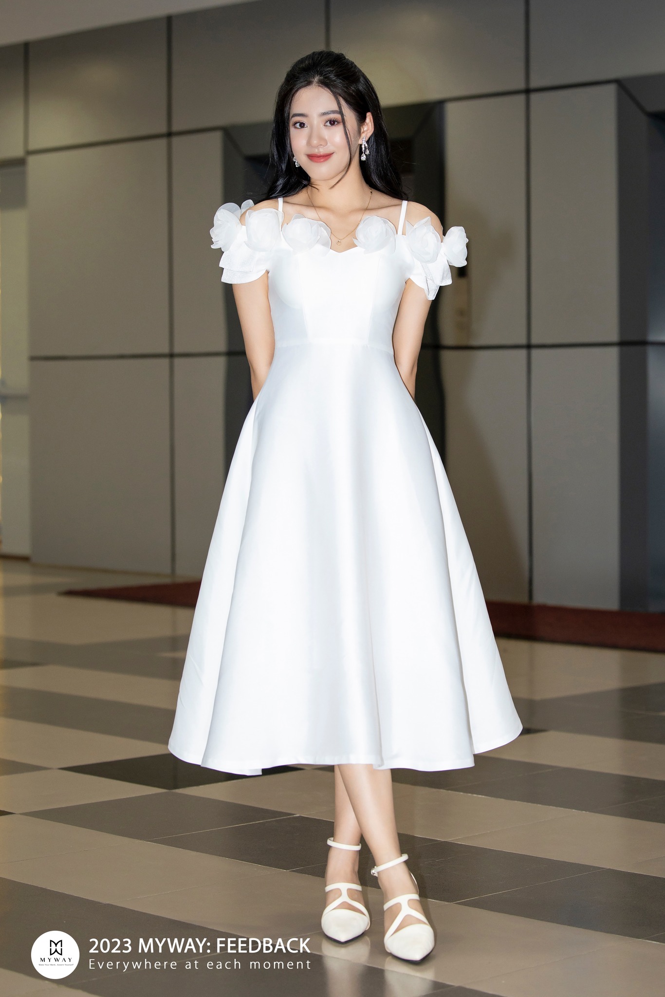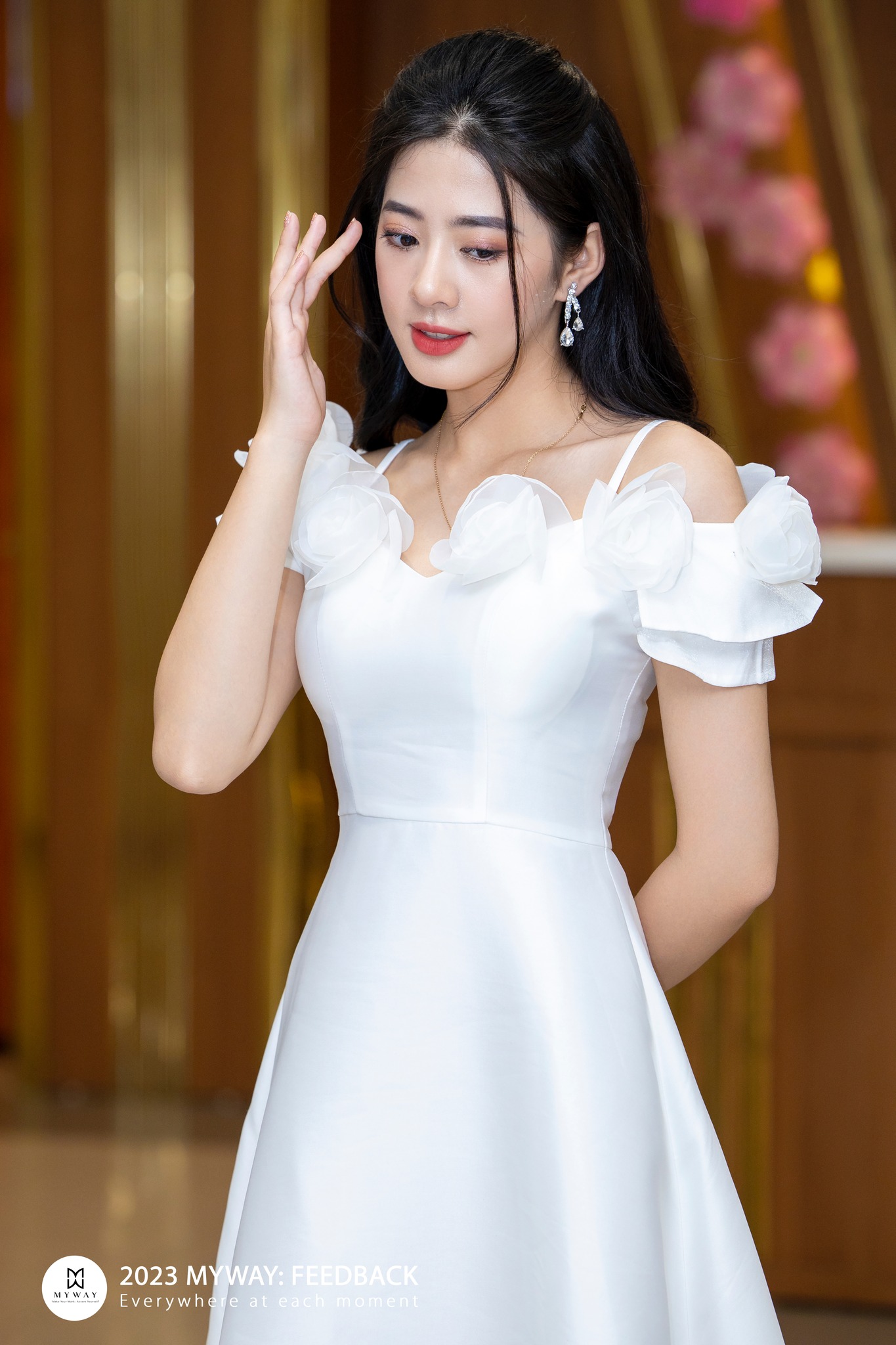 Chất chứa những rung cảm mãnh liệt về hoa và sự liên quan mật thiết với vẻ đẹp của người phụ nữ, thiết kế đầm tiệc của My Way với những bông hoa đính nổi yêu kiều, rạng rỡ tô điểm thêm vẻ đẹp sẵn có của quý cô.