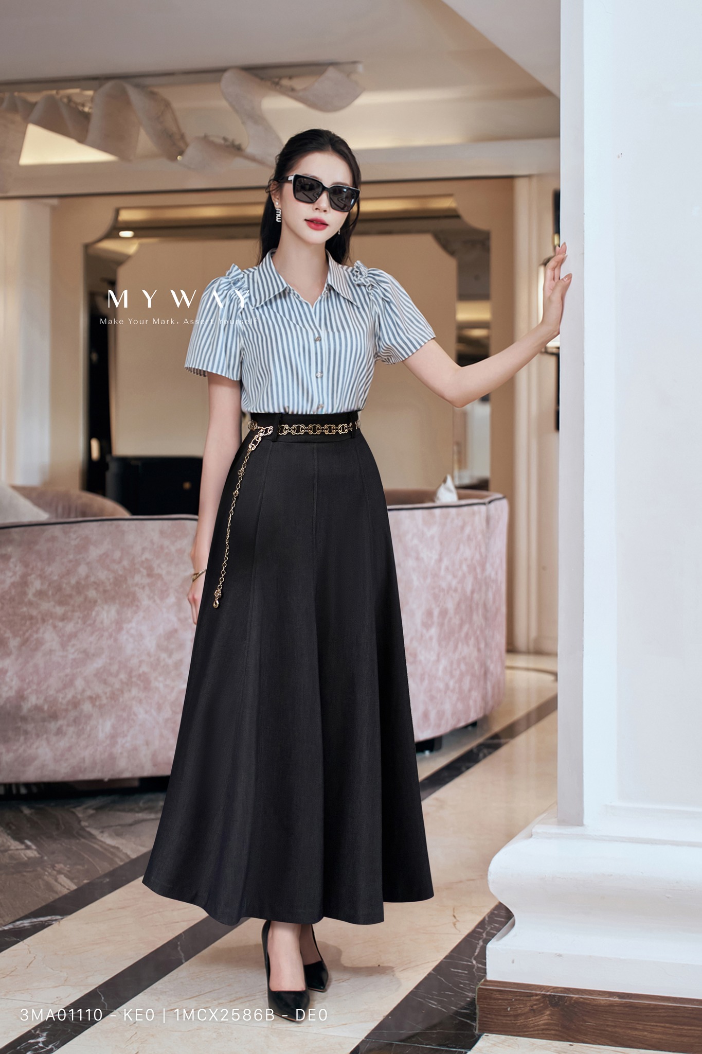 Chân váy đen dáng dài kinh điển, mang theo vẻ quyền lực và sang trọng vượt thời gian. Đường cắt may tinh tế kết hợp chiếc thắt lưng xích ánh vàng, tạo nên sự cân bằng hoàn hảo giữa nét nữ tính uyển chuyển và phong thái quý cô hiện đại.