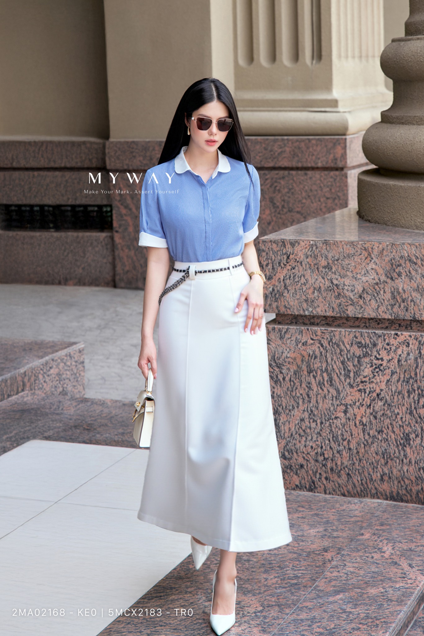 am trắng tinh khôi mang lại cảm giác thuần khiết và thanh lịch tuyệt đối. Phom dáng suông dài, kết hợp cùng áo sơ mi sắc xanh và thắt lưng ton-sur-ton, giúp tôn vinh vòng eo mà vẫn giữ được nét tối giản đầy sang trọng. Đây là thiết kế dành cho quý cô yêu sự tinh tế, trong trẻo nhưng vẫn hiện đại và khí chất – như một bản giao hưởng nhẹ nhàng giữa phố thị.