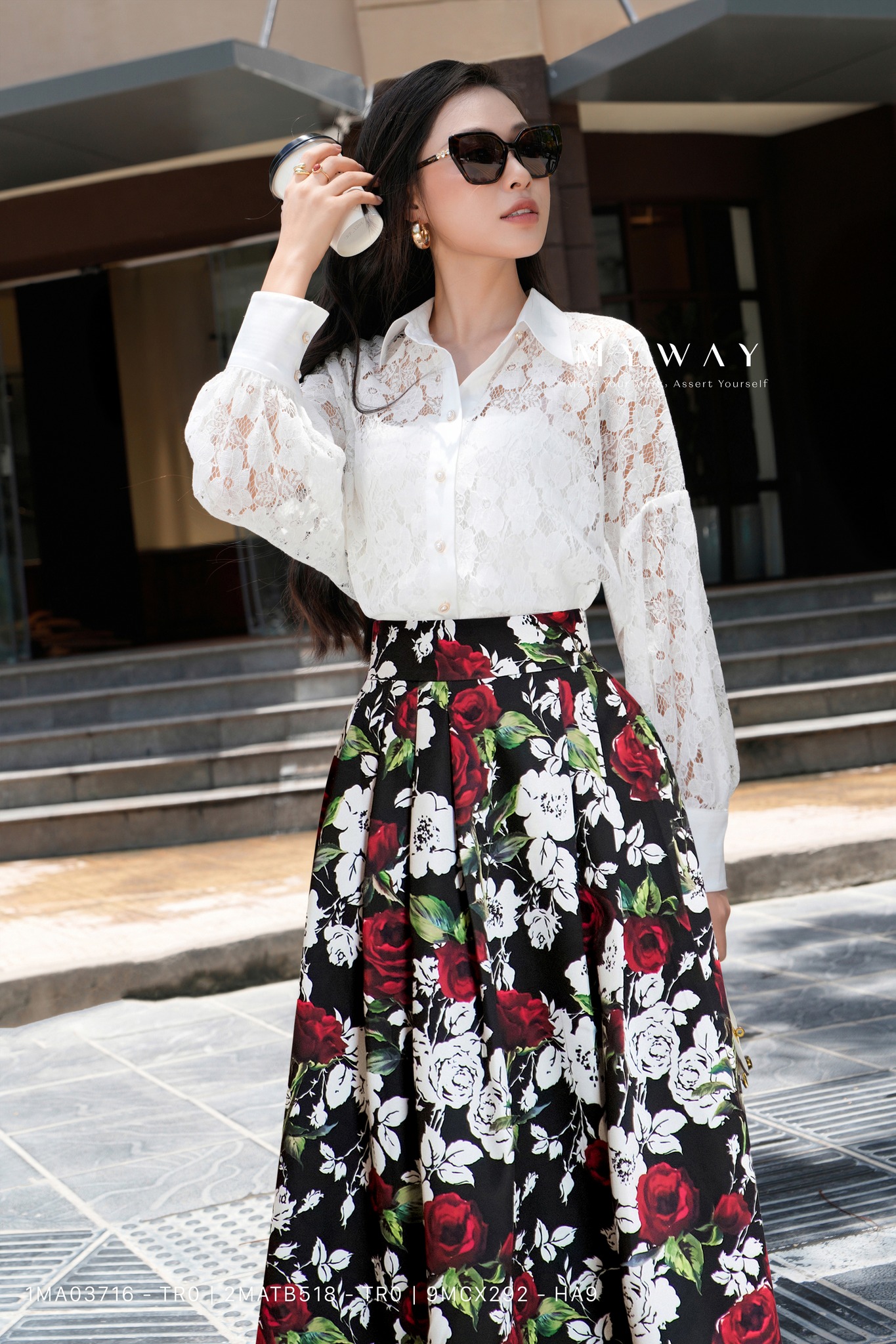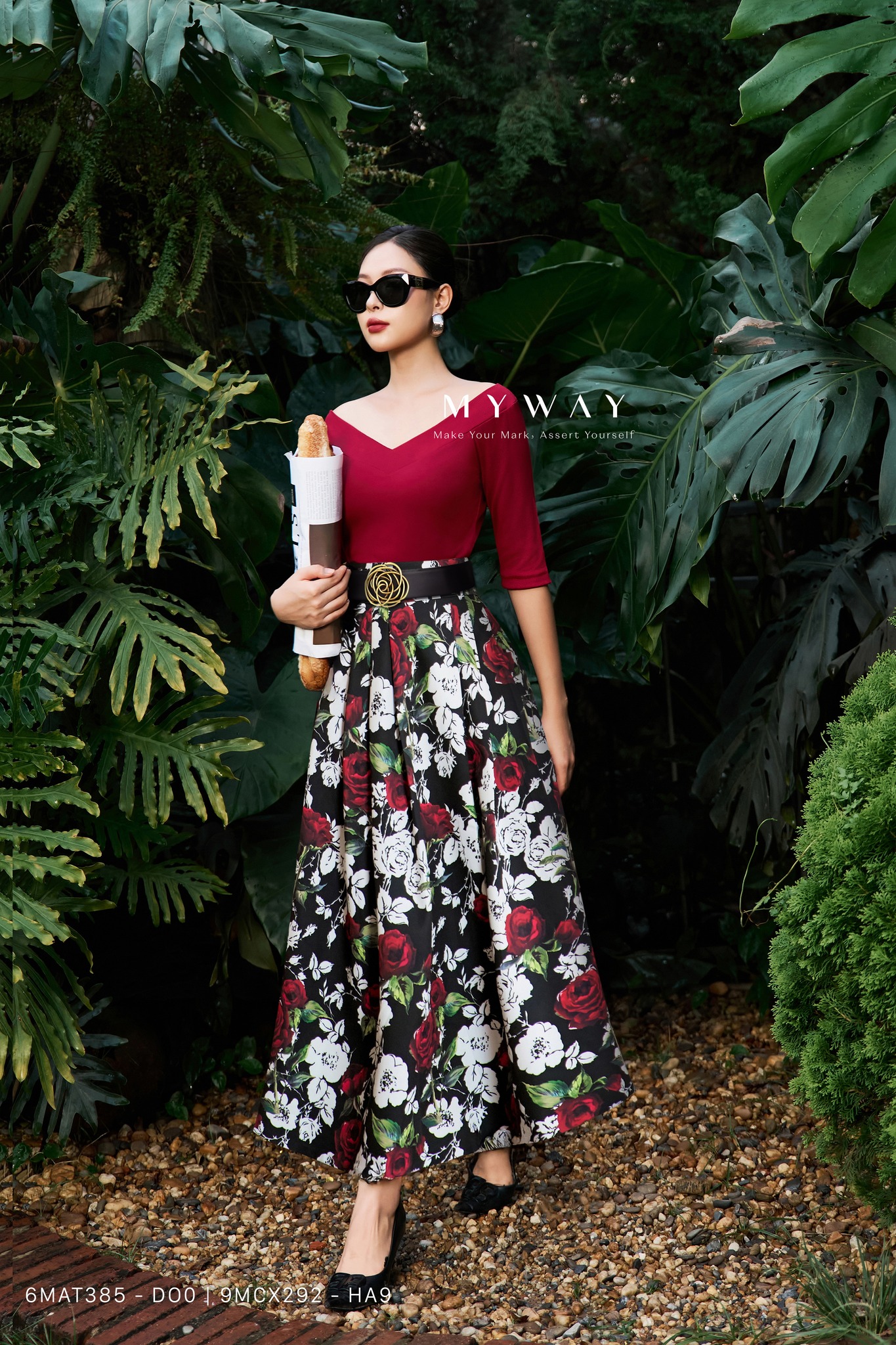 Tràn đầy cảm hứng lãng mạn, chân váy xòe in hoa hồng đỏ – trắng nổi bật như một bức tranh mùa xuân sống động. Khi hòa cùng sắc áo đỏ nồng nàn, nàng trở thành quý cô ngọt ngào, quyến rũ, rực rỡ như một đóa hồng đang độ thăng hoa.
