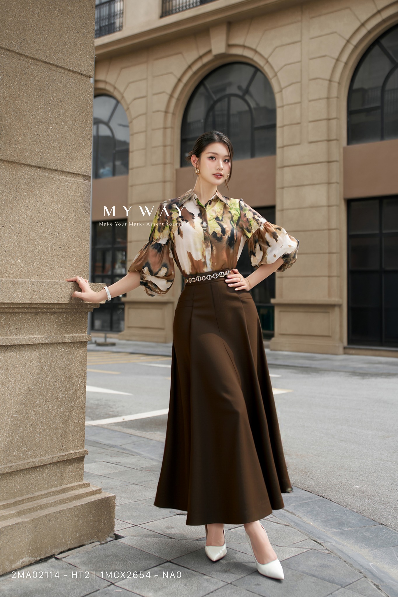 Sắc nâu trầm lắng mang hơi thở của mùa thu, uyển chuyển trên từng bước đi. Dáng xòe dài duyên dáng, khi phối cùng chiếc sơ mi họa tiết loang màu nghệ thuật, đem đến vẻ đẹp sang trọng, đầy khí chất của một quý cô thành thị hiện đại nhưng vẫn giữ nét nền nã, dịu dàng.