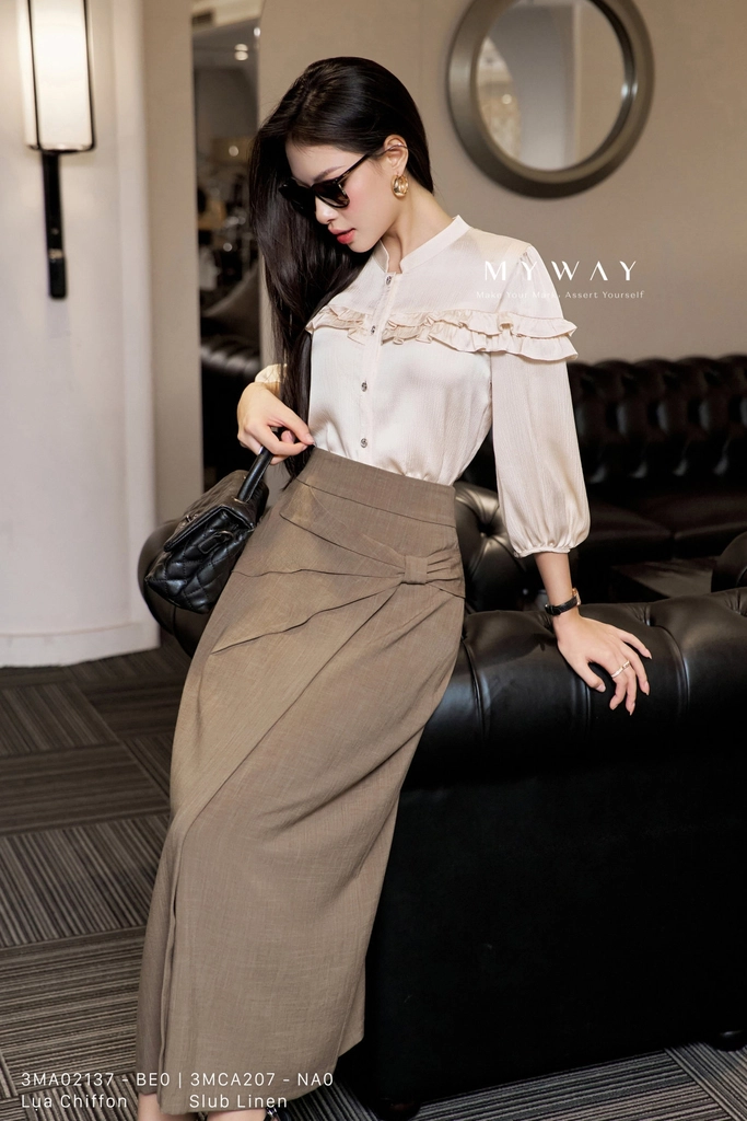 Áo sơ mi beige bèo nhún phối chân váy dài – dịu dàng và đậm chất cổ điển.