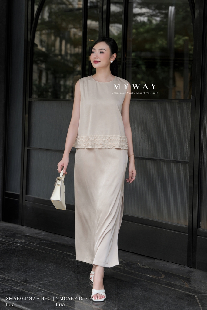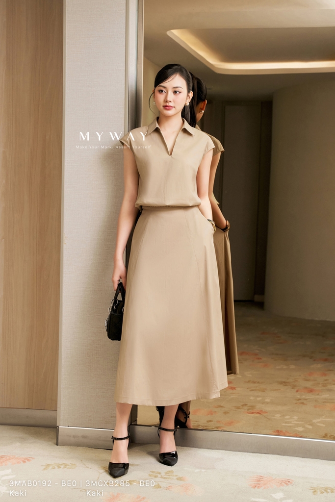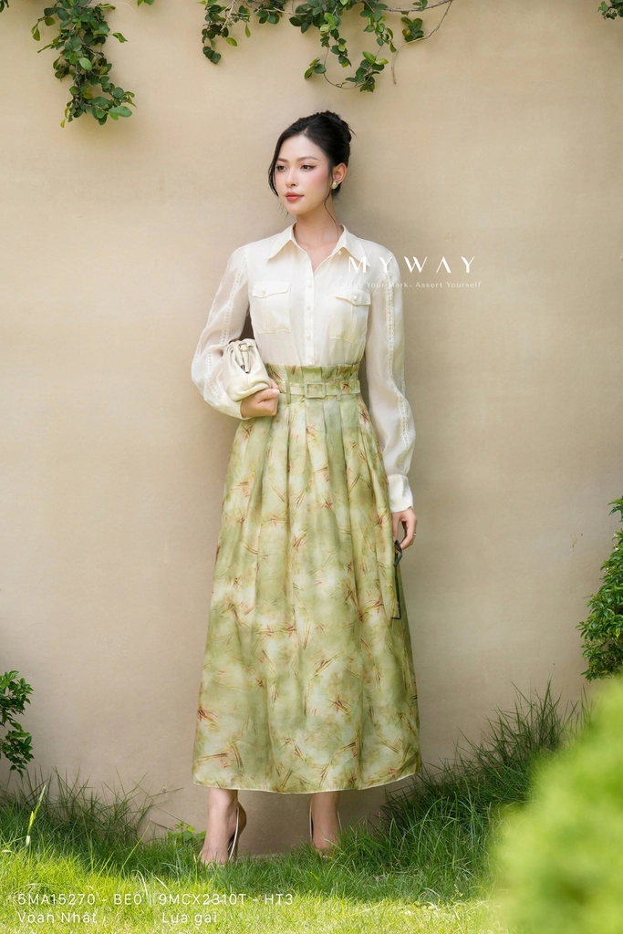 Set váy và sơ mi lụa beige – trẻ trung, phóng khoáng