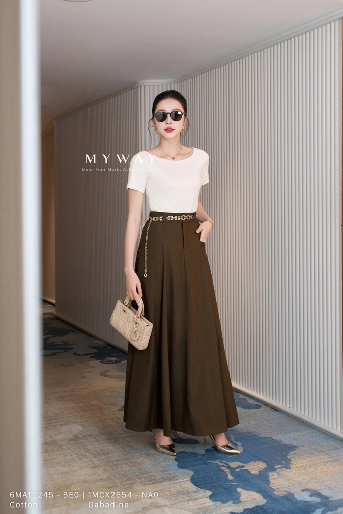 Áo beige phối váy dài nâu– nhã nhặn, nền nã, tinh tế