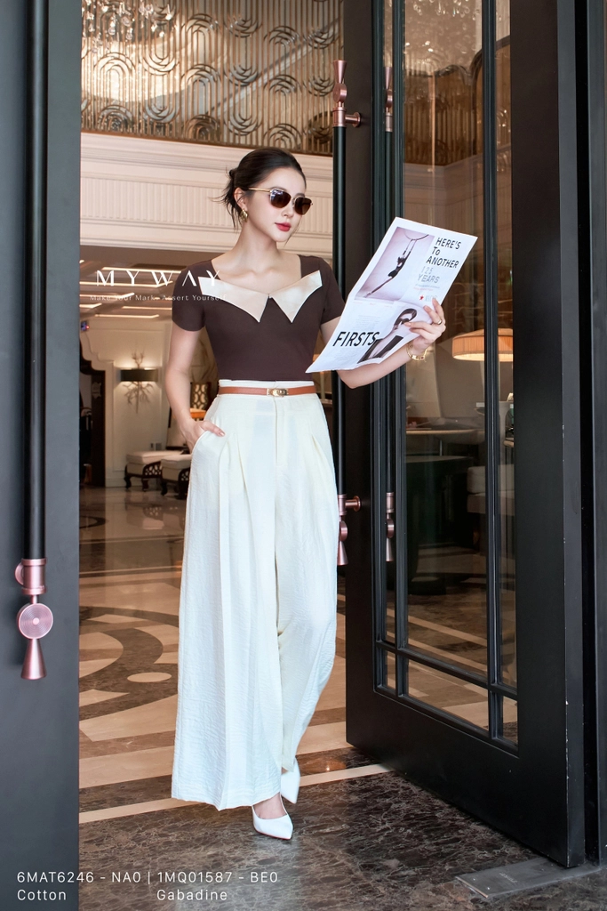 Áo nâu phối quần suông beige – hiện đại, thanh lịch, cuốn hút
