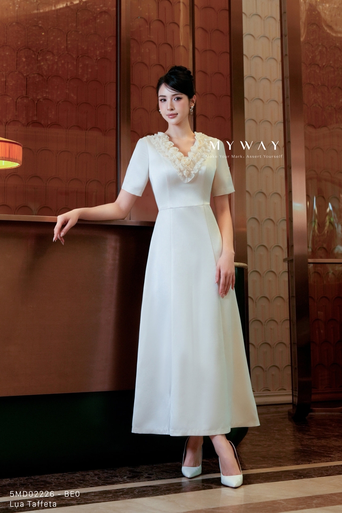 Đầm lụa taffeta beige – tinh khôi rạng rỡ, kiêu kỳ.