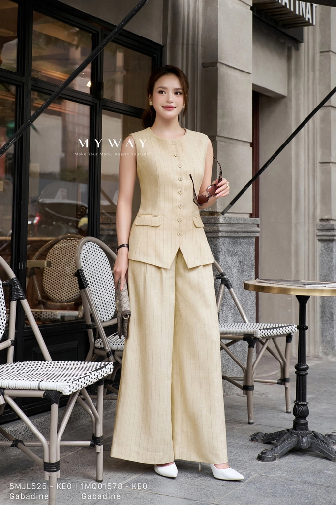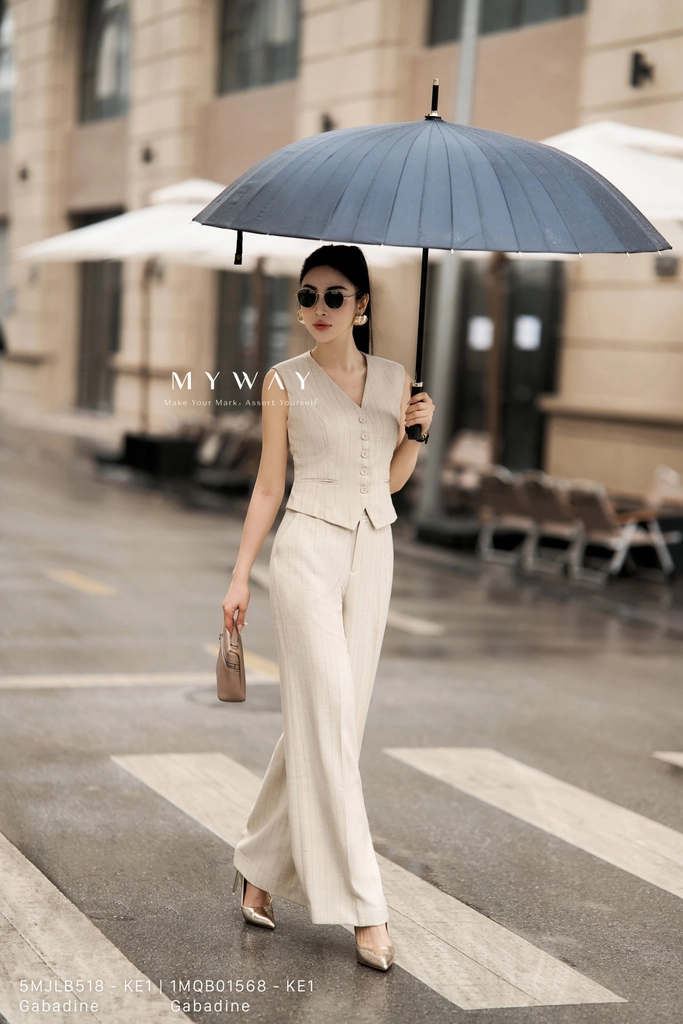 Set vest quần gabardine beige – thanh lịch, hiện đại nơi công sở.