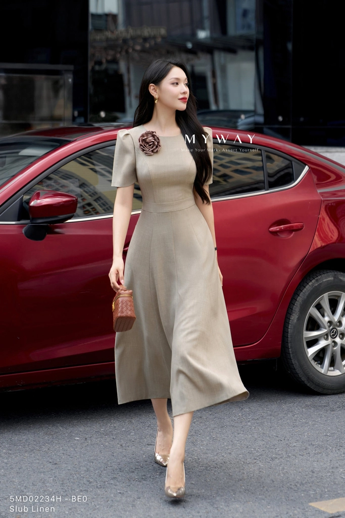 Đầm linen beige gắn hoa nổi – kiêu kỳ và trang nhã.