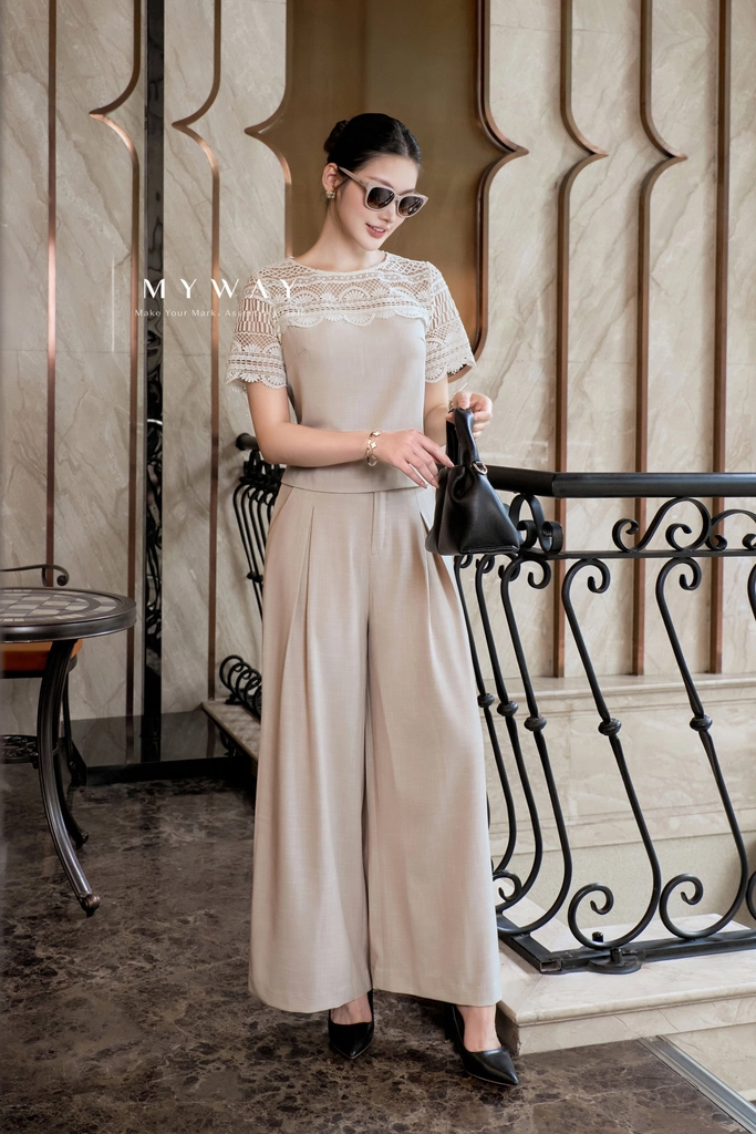 Áo ren phối gabardine beige – nữ tính tối giản, đầy cuốn hút.