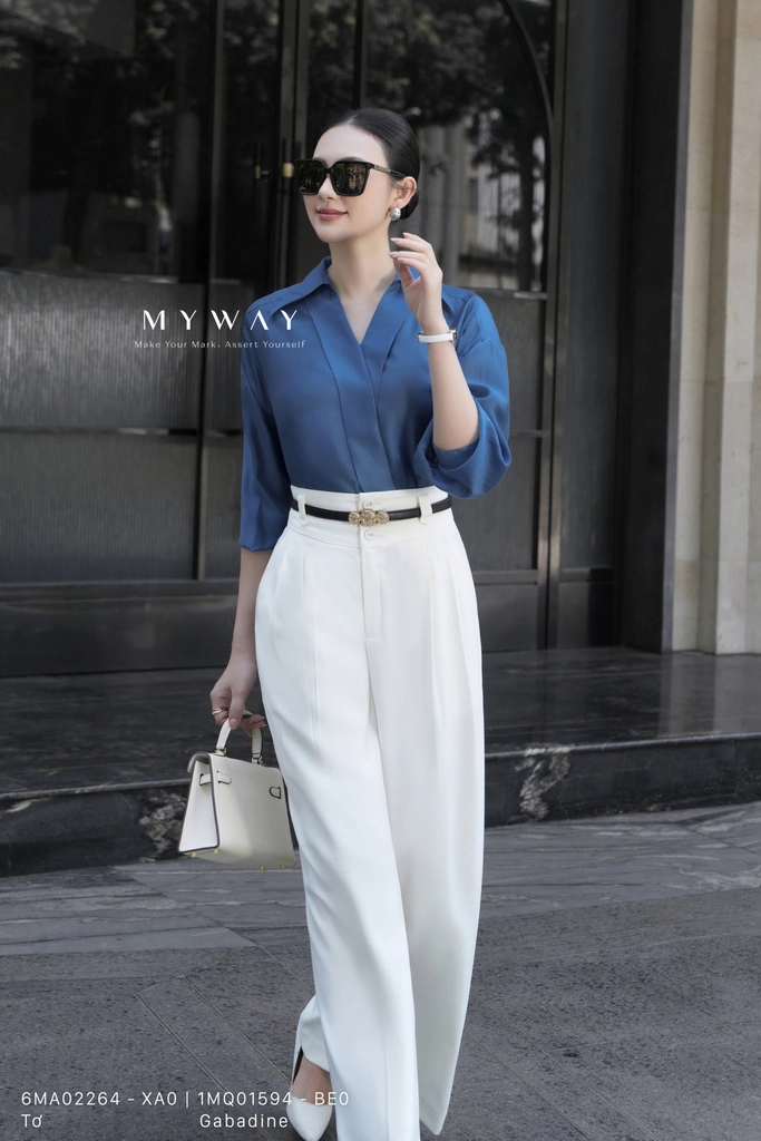 Áo tơ xanh phối quần beige – cân bằng quyền lực và tinh khôi.