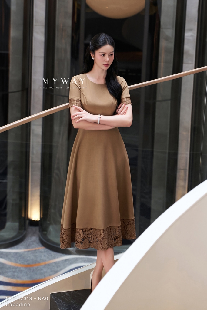 Thiết kế đầm xòe nâu cam đất nền nã, cổ tròn cổ điển và tay ngắn phối ren mềm mại, tinh tế. Chi tiết ren ở gấu váy tạo thêm điểm nhấn dịu dàng, giúp bộ trang phục vừa trang nhã, vừa mang hơi thở lãng mạn, khiến người mặc thêm phần duyên dáng và thanh lịch.