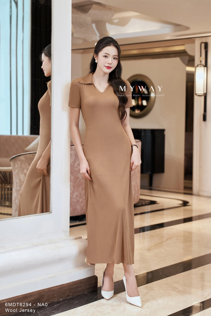 Đầm jersey dáng dài ôm rủ, thiết kế cổ bẻ nhẹ nhàng tôn lên nét nữ tính. Sự mềm mại trong chất liệu kết hợp cùng tone nâu cam trầm ấm tạo nên một tổng thể thanh thoát, quyến rũ mà không cần cầu kỳ.
