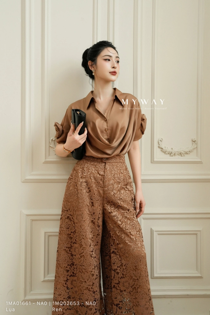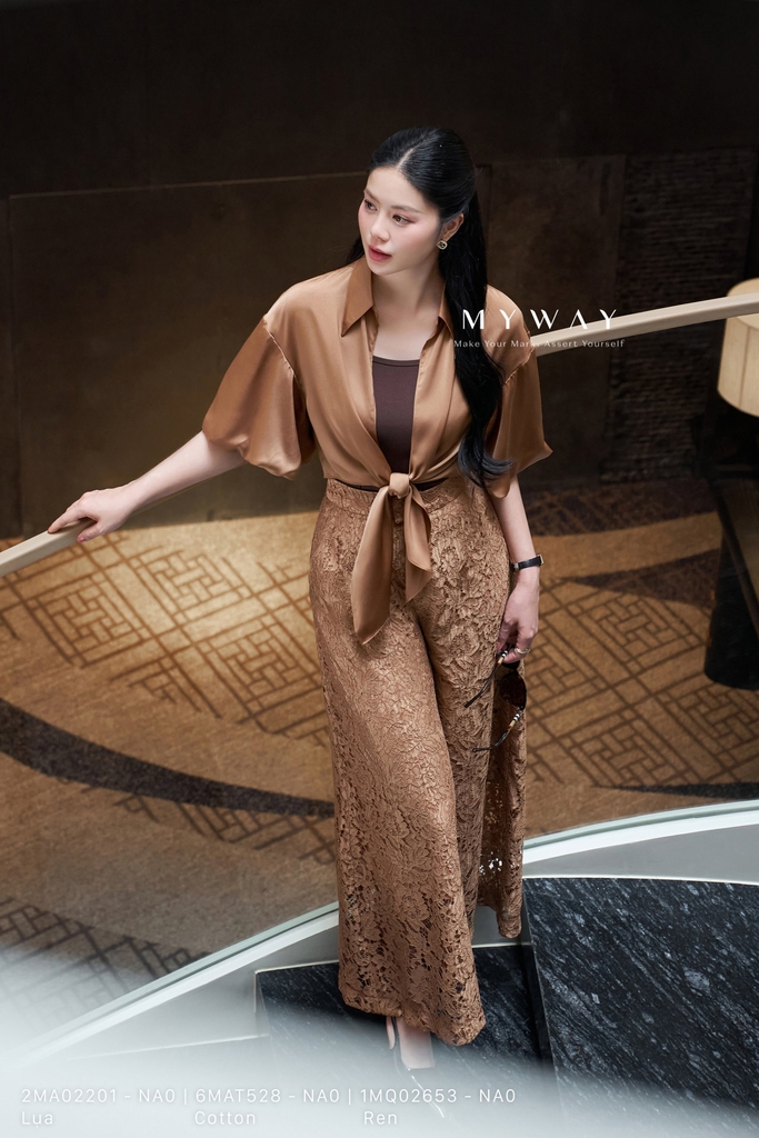 Áo sơ mi lụa nâu cam đất buộc vạt đầy phóng khoáng, đi kèm áo trong màu đồng điệu, kết hợp cùng quần ren ống rộng độc đáo. Sự hòa quyện giữa chất liệu mềm mại và chi tiết ren tinh xảo mang đến tổng thể vừa cá tính, vừa quyến rũ, là lựa chọn hoàn hảo cho những quý cô hiện đại yêu thích sự mới mẻ.