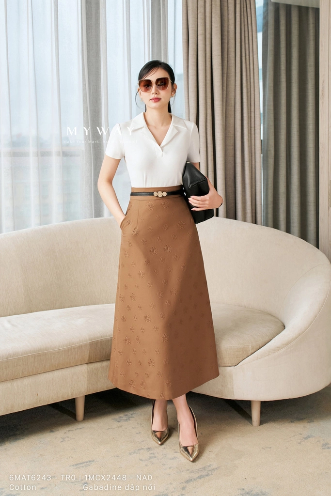 Thanh nhã và tinh tế với áo polo trắng phối chân váy dáng dài gam nâu cam có họa tiết dập nổi. Thiết kế vừa cổ điển vừa hiện đại, mang đến vẻ ngoài thanh lịch, lý tưởng cho nàng công sở thanh xuân.